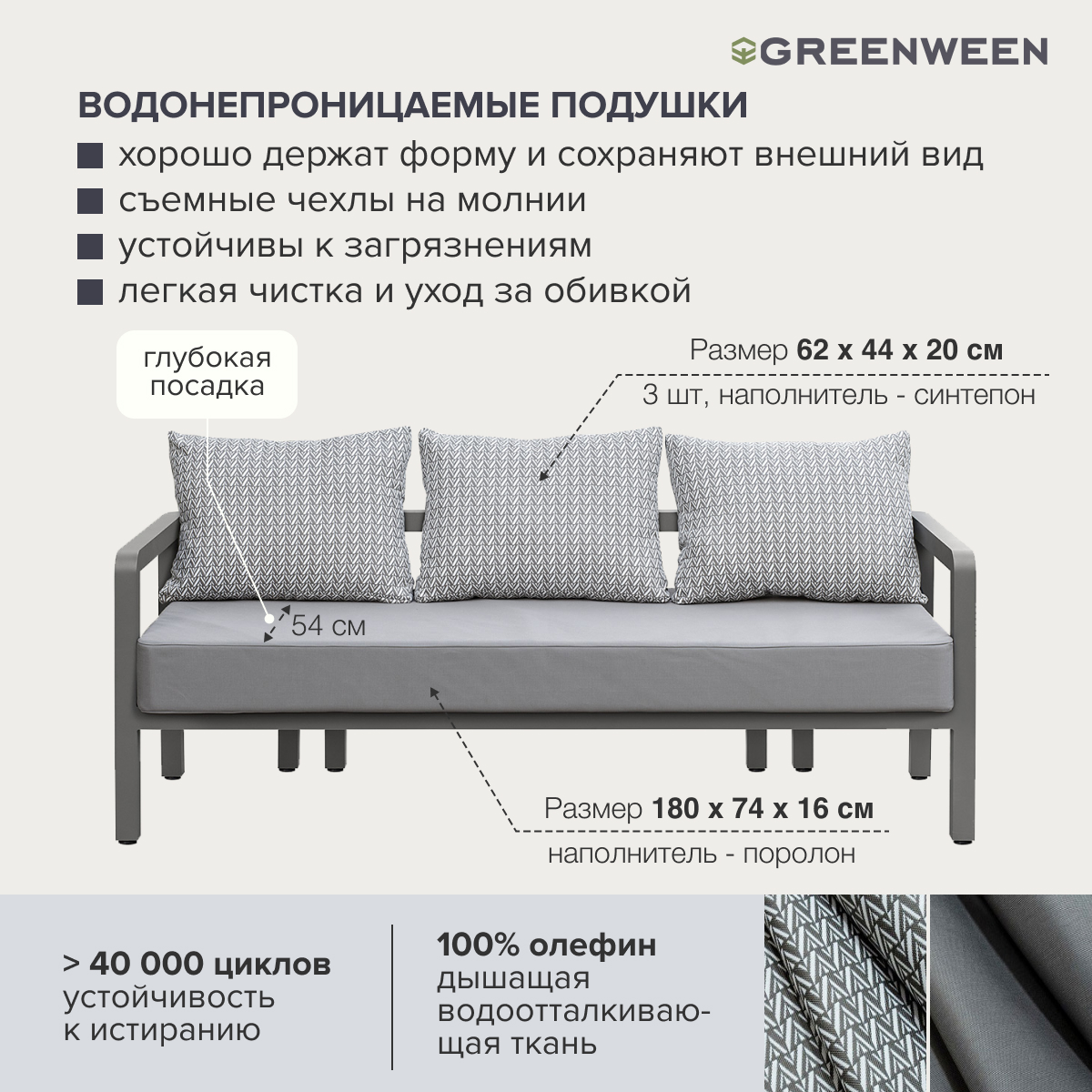 Цельносварной каркас из алюминия с матовым полимерным покрытием оттенка Lava устойчив к коррозии и влиянию внешней среды. Это обеспечивает долговечность и надежность мебели при использовании на открытом воздухе. Габариты дивана 190x65х76см, максимальная нагрузка 180 кг. Габариты кресла 74х65x76 см, максимальная нагрузка 150 кг. Высота от пола до сидения (металла) 32 см. Эргономичная форма кресла и дивана обеспечивает правильную посадку, что делает его идеальным местом для отдыха. Уличный диван и кресло дополняют большая подушка для сидения и мягкие подушки под спину в чехлах из водонепроницаемой ткани, 100% олефин. Дышащий материал устойчив к загрязнениям и воздействию воды, препятствует образованию пятен от напитков и лосьонов для загара, облегчает чистку и уход за обивкой. Большая подушка темно-серого цвета обеспечивает глубокую посадку, размеры сидения для дивана 180х74х16 см, сидения для кресла 64х74х16 см, подушки под спину с геометрическим принтом, размеры 62х44х20 см. В мебельных чехлах установлена молния, при необходимости их можно снять и почистить. Набивка большой подушки - поролон, подушка для спины набита синтепоном, обе упакованы в несъёмный чехол из спанбонда.