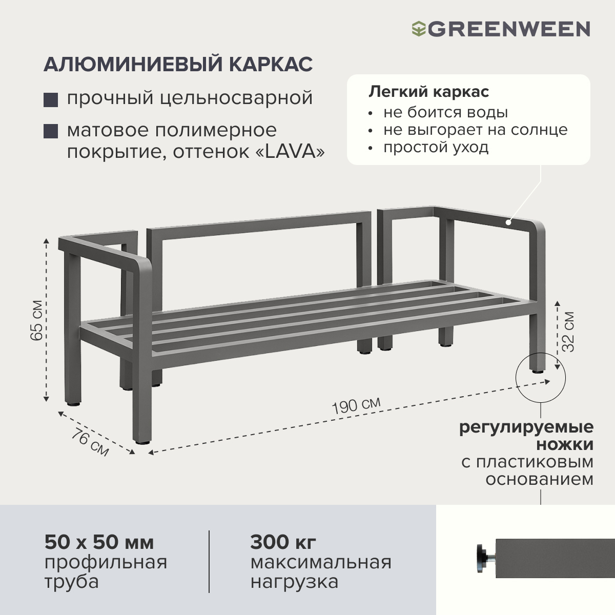 Коллекция уличной мебели AMALFI специально разработана для эксплуатации на открытой террасе, у бассейна. Прочная металлическая конструкция и регулируемые ножки обеспечивают устойчивость на любой поверхности. Съемные чехлы мягких деталей устойчивы к загрязнениям и воздействию воды. Цельносварной каркас из алюминия с матовым полимерным покрытием оттенка Lava устойчив к коррозии и влиянию внешней среды. Это обеспечивает долговечность и надежность мебели при использовании на открытом воздухе. Габариты дивана 190x65х76см, максимальная нагрузка 180 кг. Габариты кресла 74х65x76 см, максимальная нагрузка 150 кг. Высота от пола до сидения (металла) 32 см. Эргономичная форма кресла и дивана обеспечивает правильную посадку, что делает его идеальным местом для отдыха. Уличный диван и кресло дополняют большая подушка для сидения и мягкие подушки под спину в чехлах из водонепроницаемой ткани, 100% олефин. Дышащий материал устойчив к загрязнениям и воздействию воды, препятствует образованию пятен от напитков и лосьонов для загара, облегчает чистку и уход за обивкой.Большая подушка темно-серого цвета обеспечивает глубокую посадку, размеры сидения для дивана 180х74х16 см, сидения для кресла 64х74х16 см, подушки под спину с геометрическим принтом, размеры 62х44х20 см. В мебельных чехлах установлена молния, при необходимости их можно снять и почистить. Набивка большой подушки - поролон, подушка для спины набита синтепоном, обе упакованы в несъёмный чехол из спанбонда.