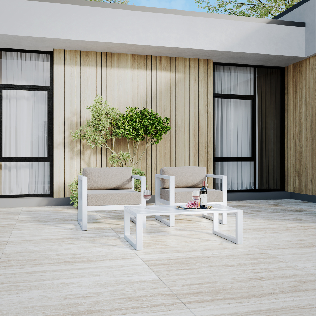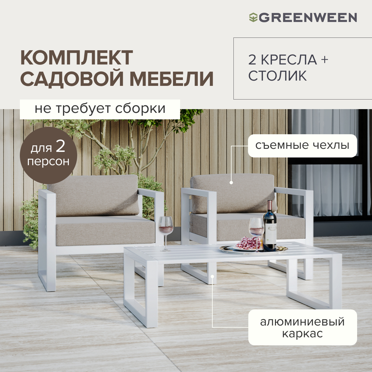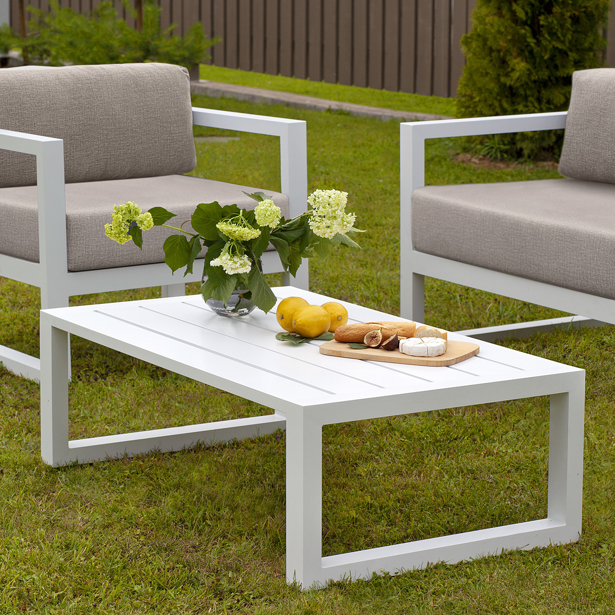 Комплект уличной мебели CAPRI создает комфортное пространство для отдыха в саду, на террасе, у бассейна. В наборе представлены 2 кресла и журнальный столик. Каркас изготовлен из высокопрочного алюминия, на сиденьях предусмотрены удобные подушки пепельно-коричневого оттенка.