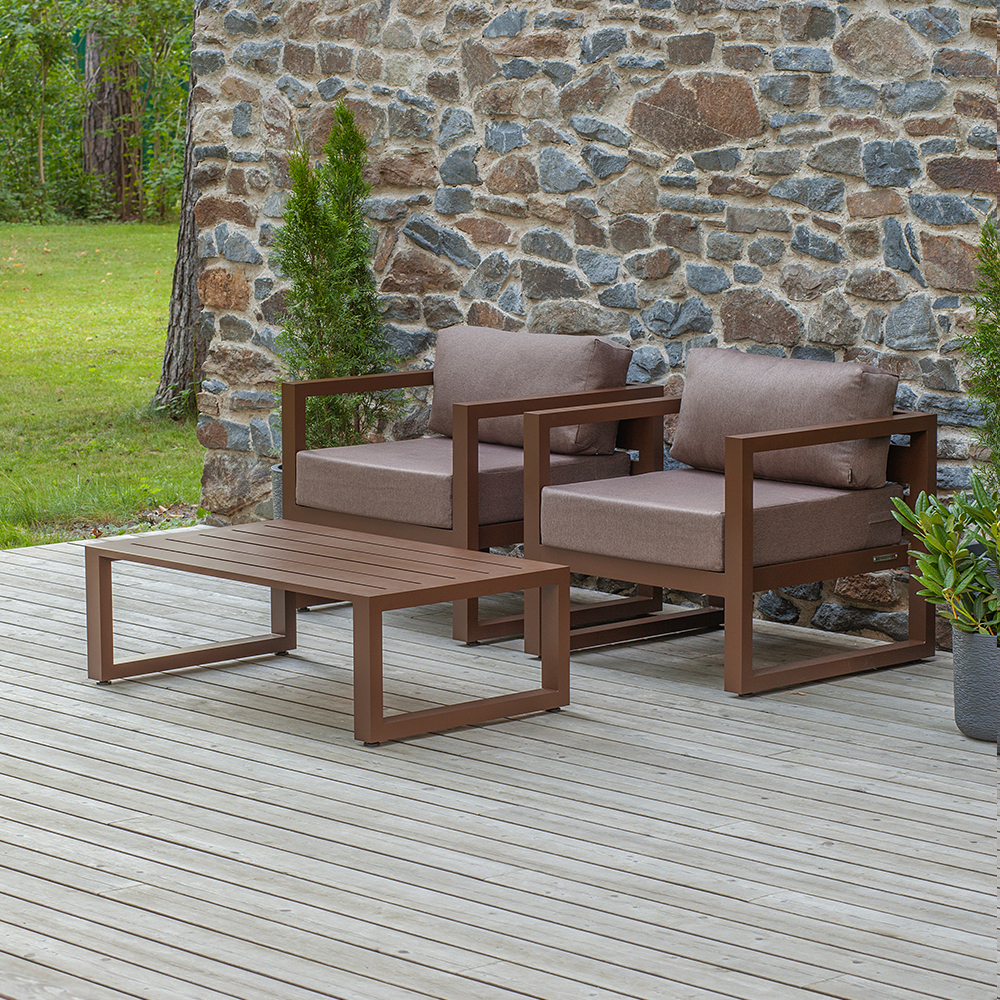Комплект уличной мебели CAPRI создает комфортное пространство для отдыха в саду, на террасе, у бассейна. В наборе представлены 2 кресла и журнальный столик. Каркас изготовлен из высокопрочного алюминия, на сиденьях предусмотрены удобные подушки коричневого оттенка.