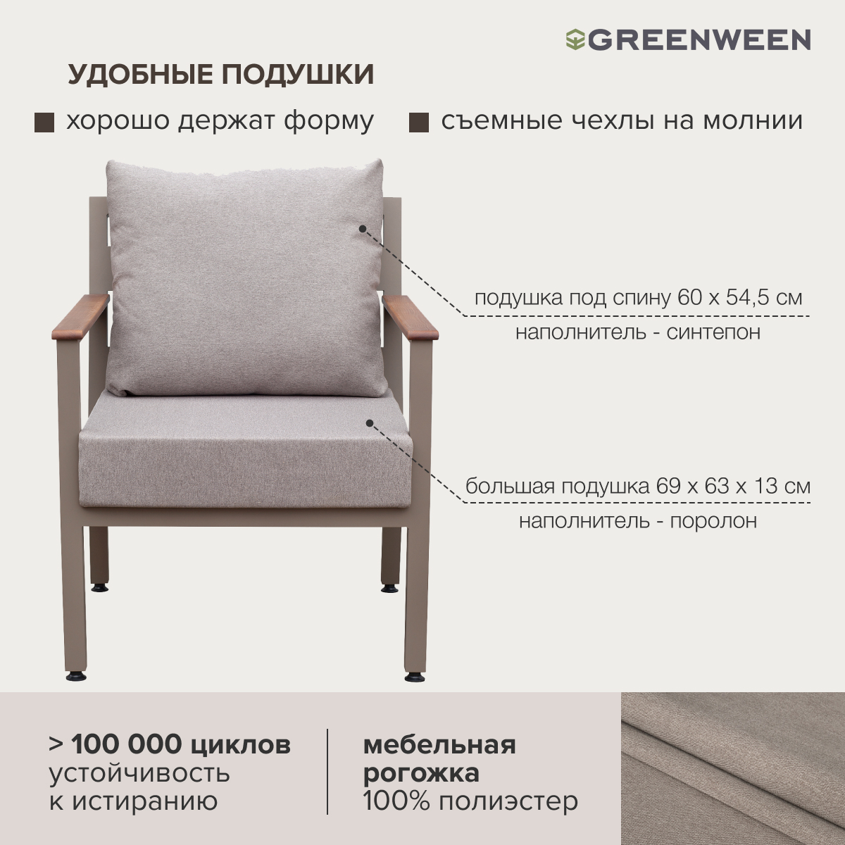 Прочный алюминиевый каркас дивана и кресла дополняют деревянные подлокотники и удобные подушки со съемными чехлами для комфортной посадки. Металлическая мебель подходит для использования на улице и в помещении.