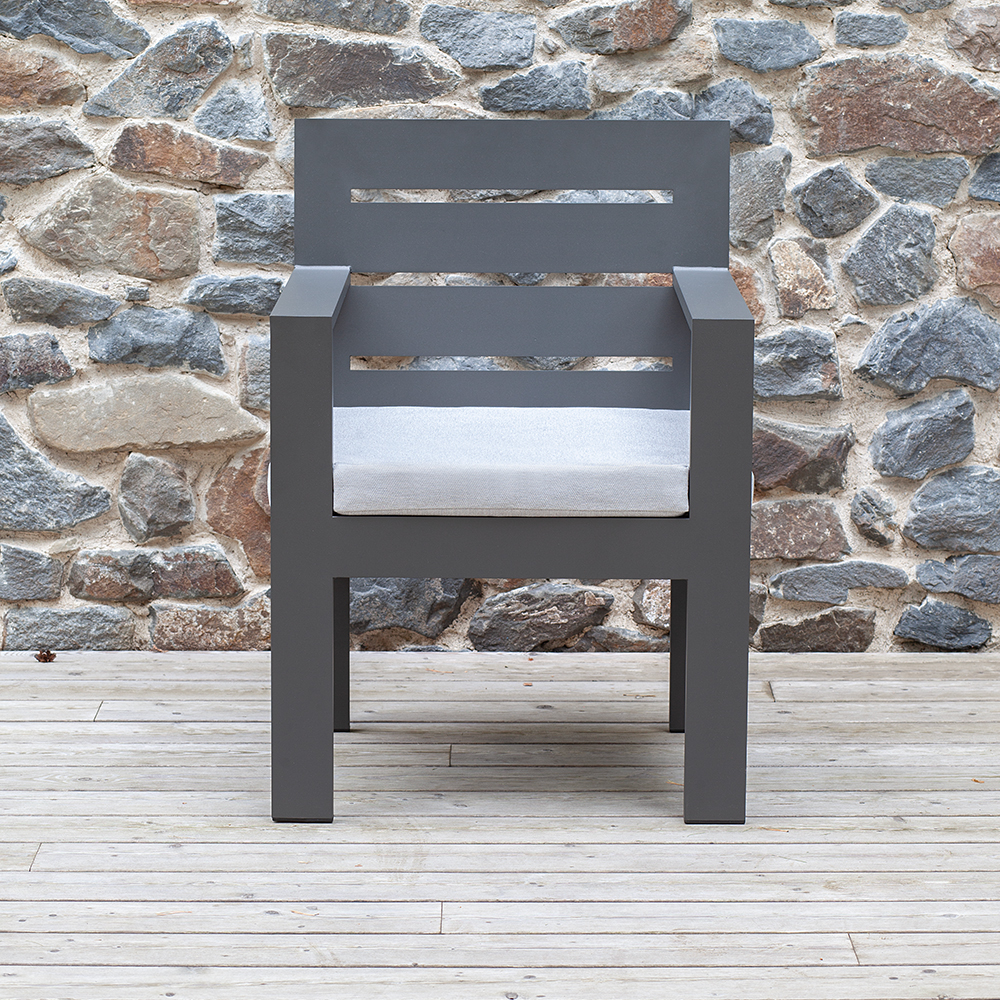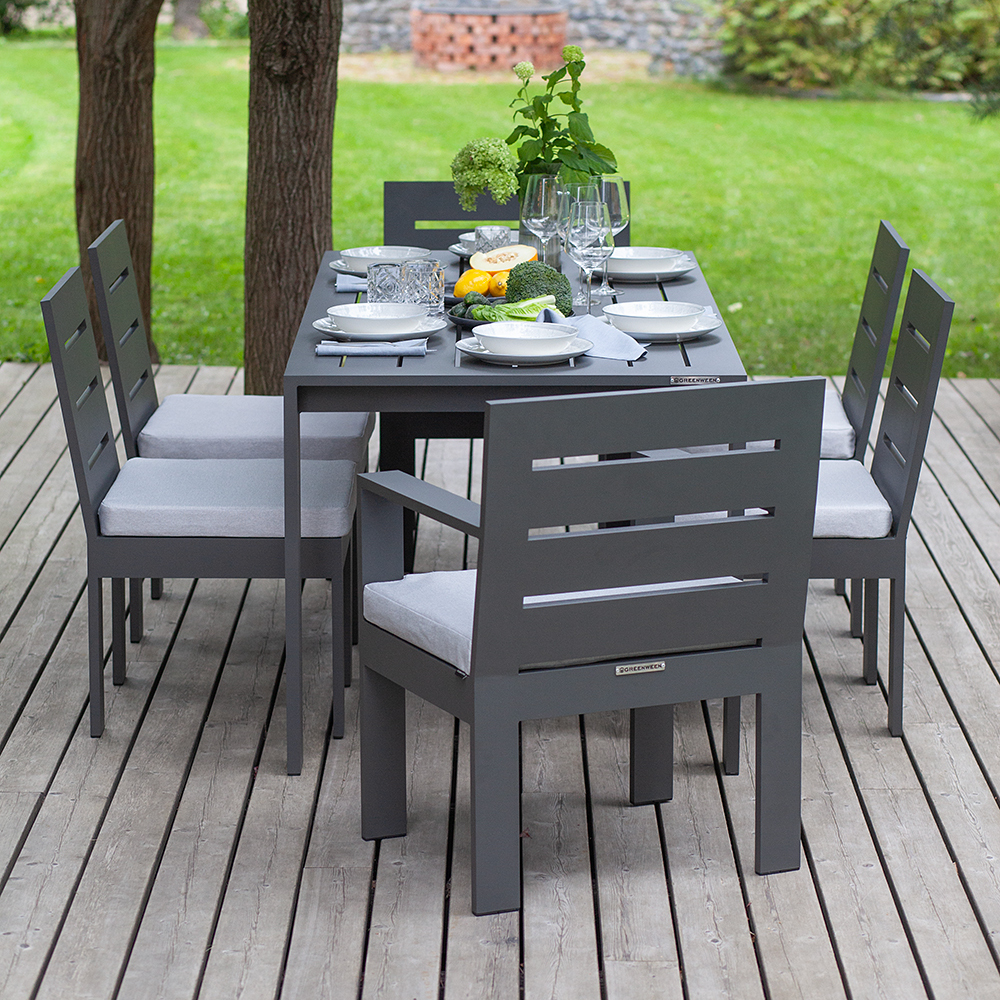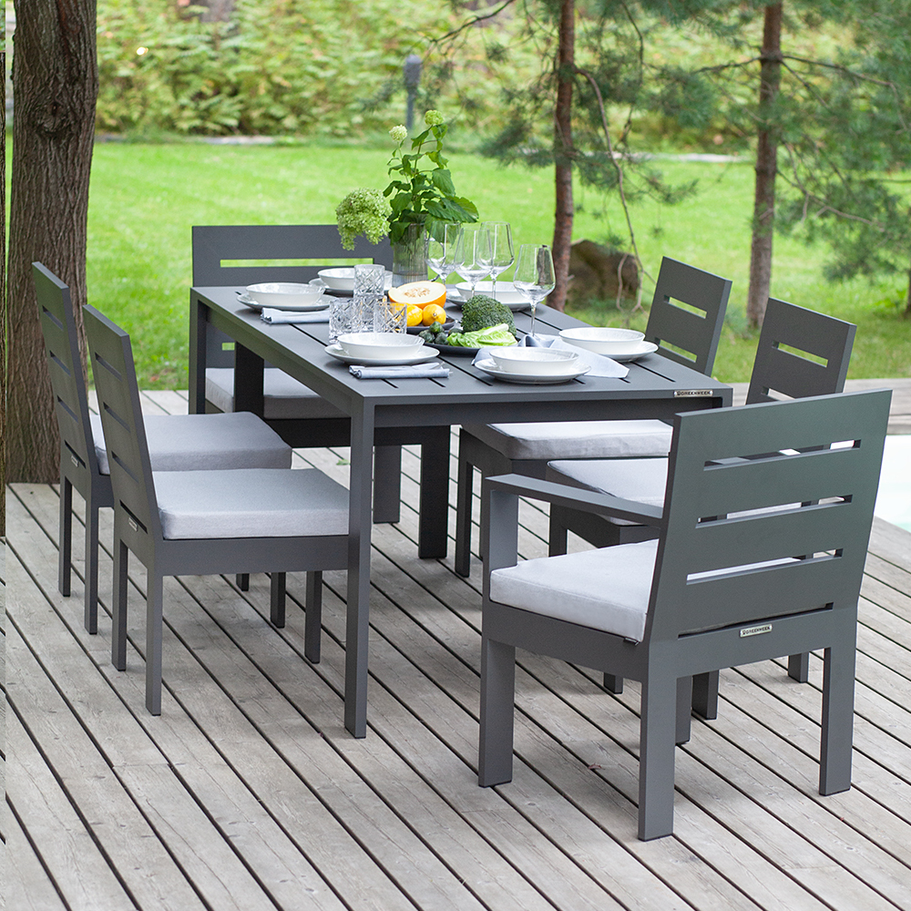 Коллекция садовой мебели KORFU привлекает внимание современным дизайном и долговечностью. Уличный комплект разработан дизайнерами для создания обеденной зоны в загородном доме, клубе, отеле, ресторане. Алюминиевая мебель отличается прочностью и долгим сроком службы, подходит для использования на улице и в помещении.