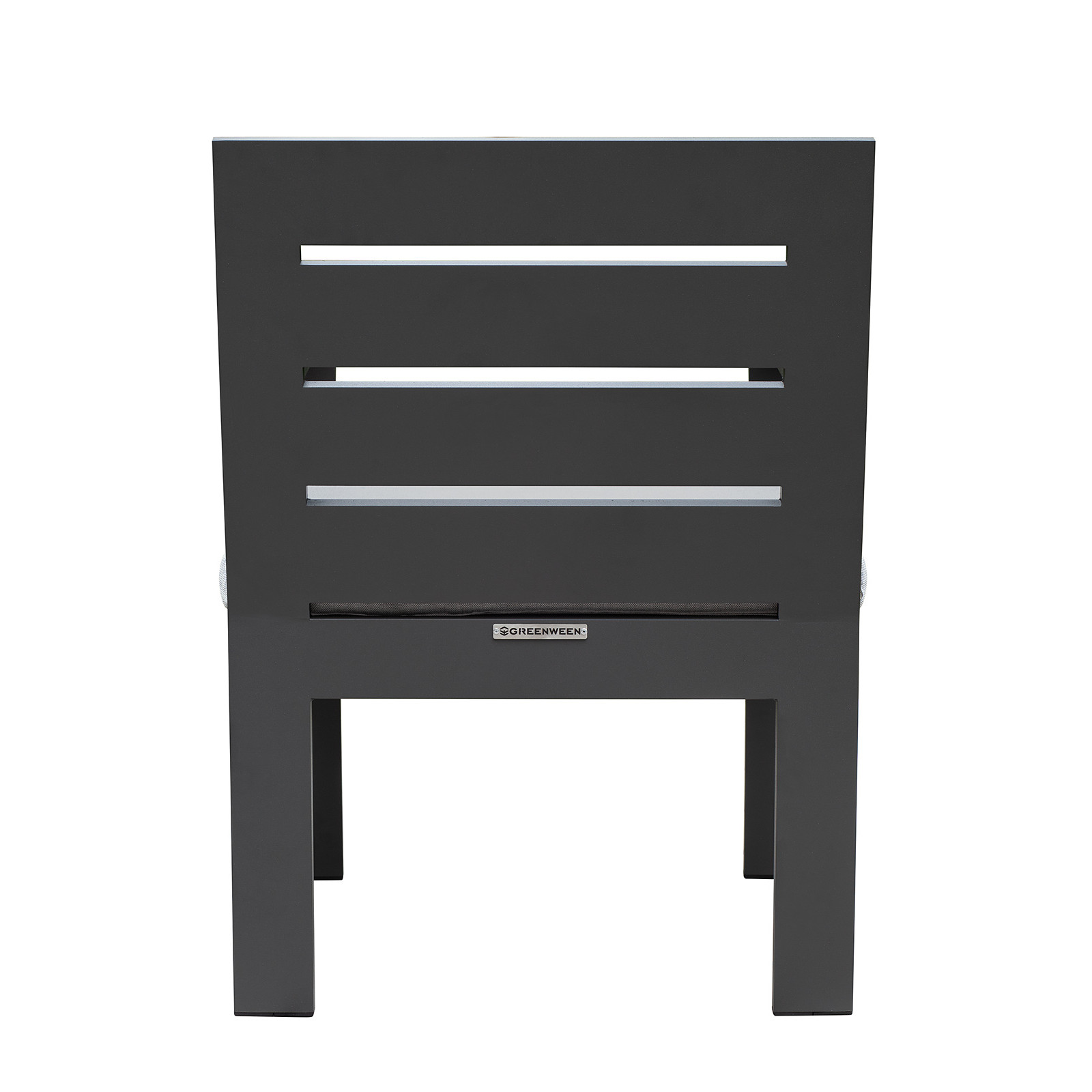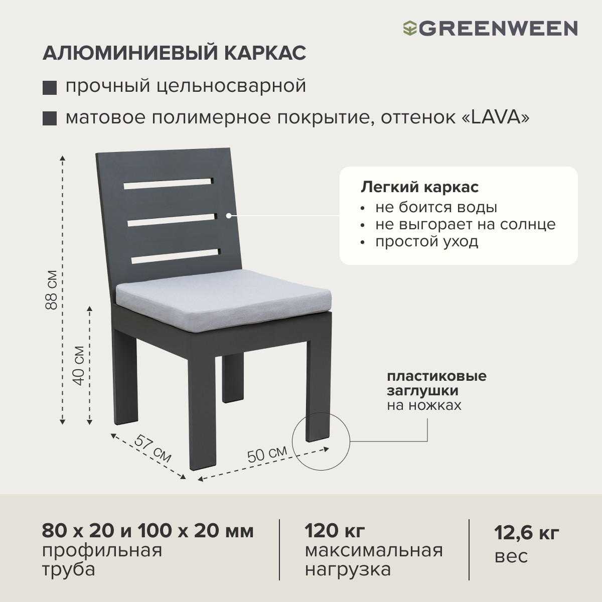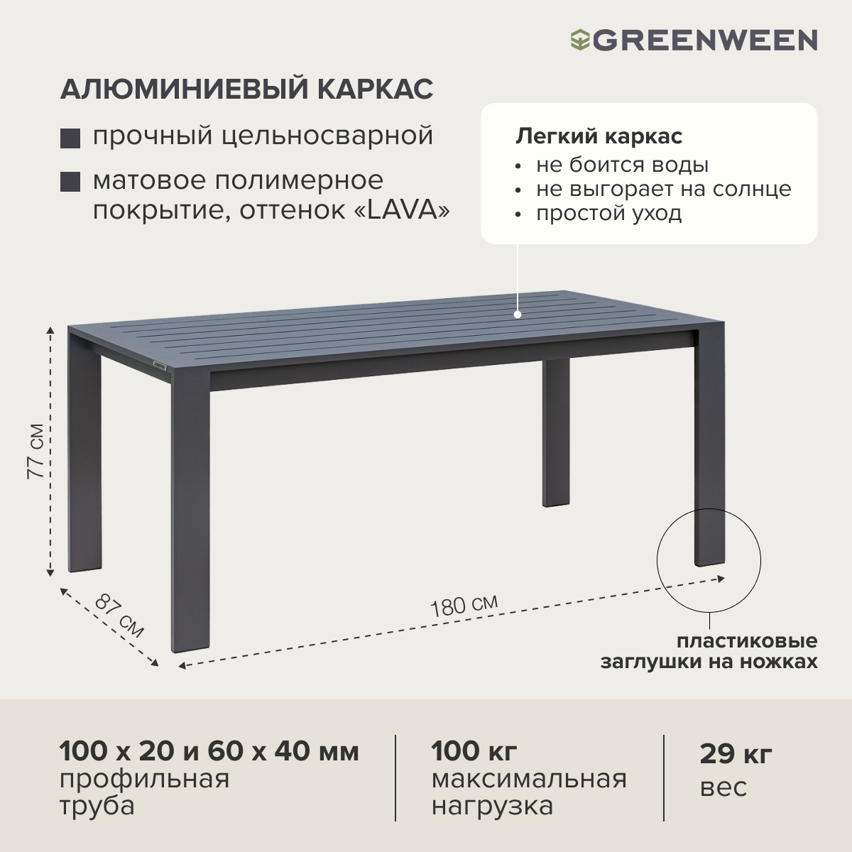 Каркас мебели изготовлен из алюминиевой профильной трубы с матовым полимерным покрытием, которое отличается повышенной прочностью, устойчивостью к царапинам. Профессиональная порошковая покраска обеспечивает долговечность и легкость в уходе. Современное производство Greenween гарантирует надежность и эстетику сварных швов металлической мебели.