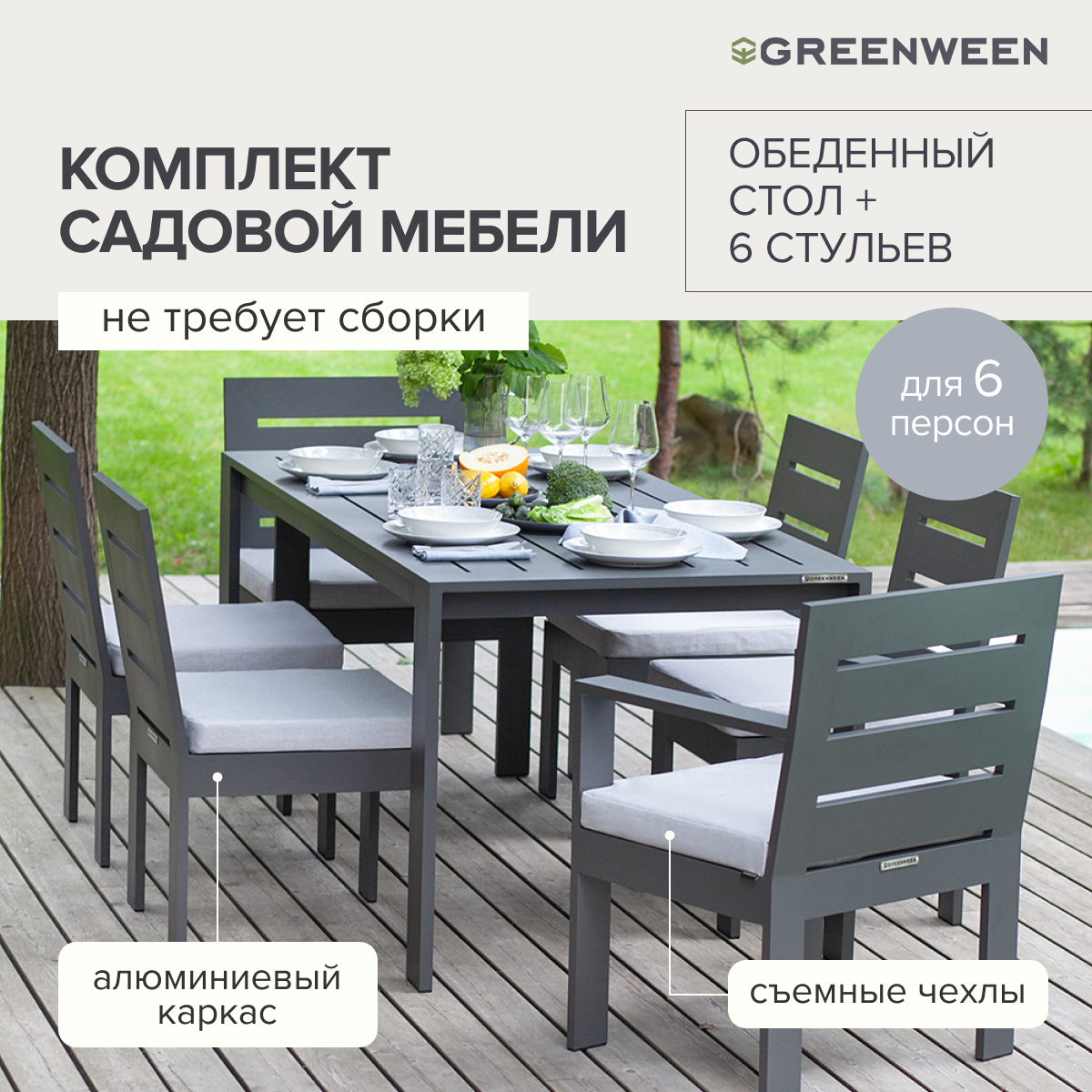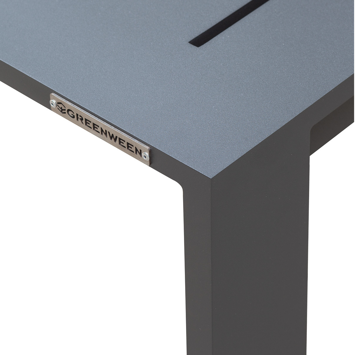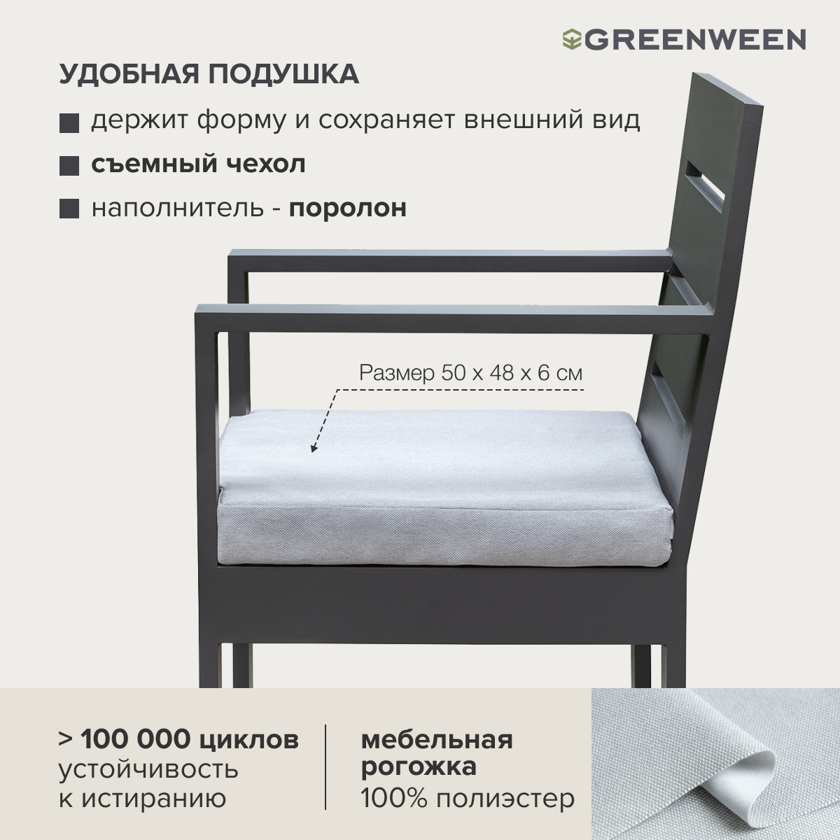 Каркас мебели изготовлен из алюминиевой профильной трубы с матовым полимерным покрытием, которое отличается повышенной прочностью, устойчивостью к царапинам. Профессиональная порошковая покраска обеспечивает долговечность и легкость в уходе. Современное производство Greenween гарантирует надежность и эстетику сварных швов металлической мебели.