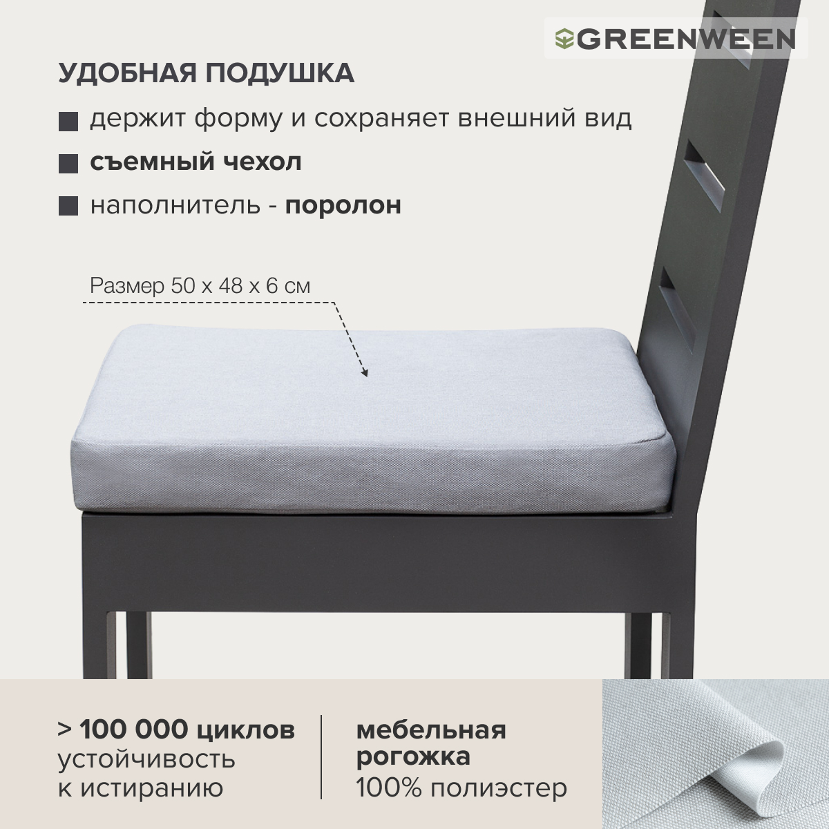 Прочные стулья дополняют мягкие подушки для комфортной посадки. Подушки хорошо держат форму и сохраняет внешний вид. Чехол подушки на молнии выполнен из мебельной рогожки, 100% полиэстер, плотность ткани 300 г/кв.м, стойкость к истиранию 100 000 циклов. Гипоаллергенный, дышащий материал отличается натуральным видом и долгим сроком службы.