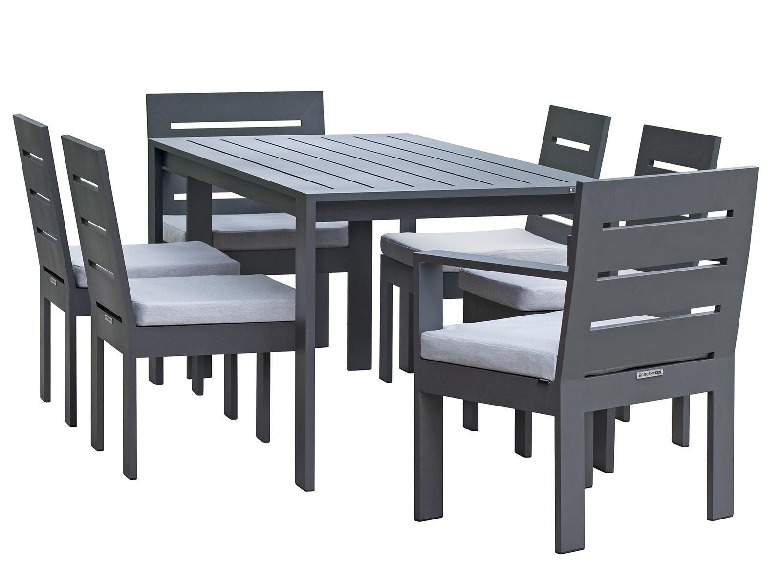 В уличном наборе KORFU представлены большой обеденный стол и 6 стульев с подушками, в комплекте 2 стула с подлокотниками, 4 стула без подлокотников. Каркас мебели изготовлен из высокопрочного алюминия с полимерным покрытием в оттенке LAVA.