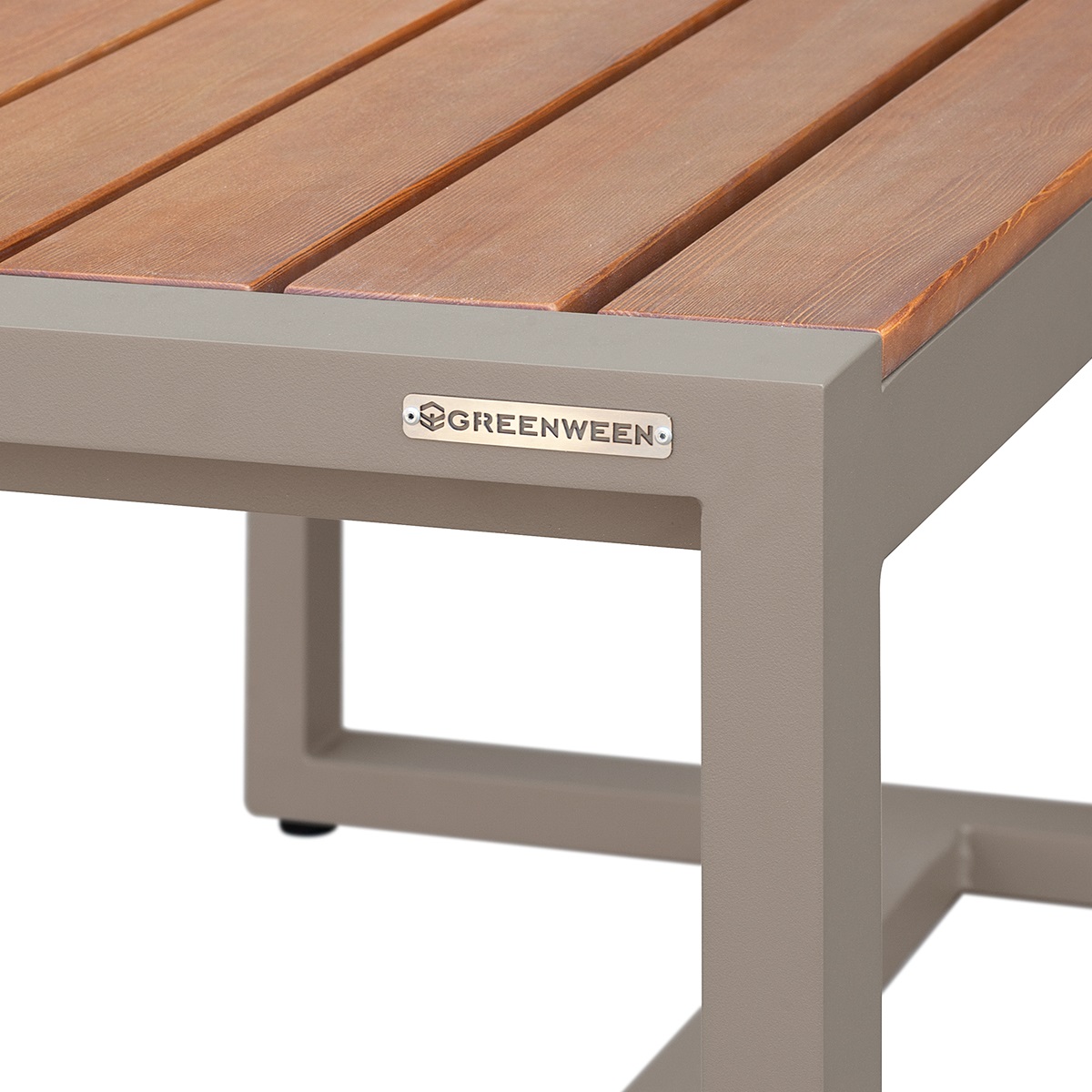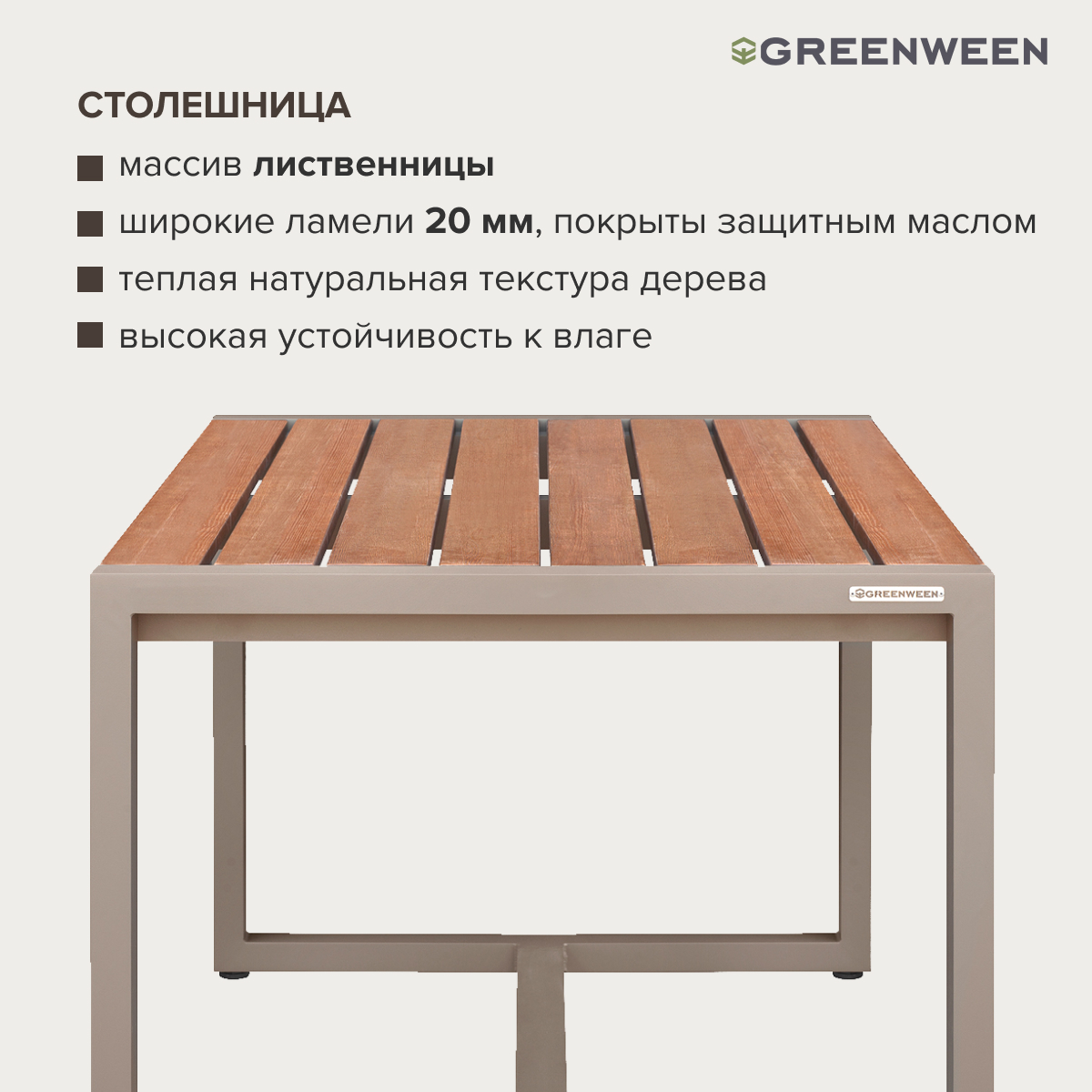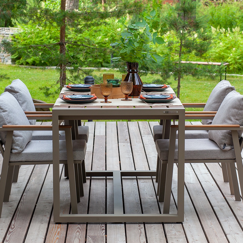 Каркас изготовлен из прочного алюминия, столешница и подлокотники — из массива лиственницы, а стулья дополнены мягкими подушками.