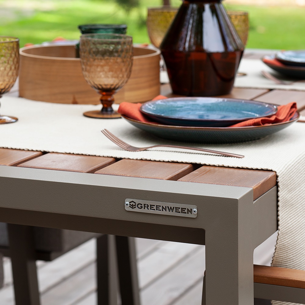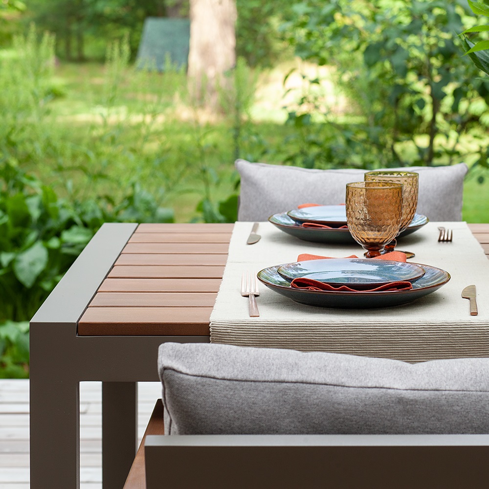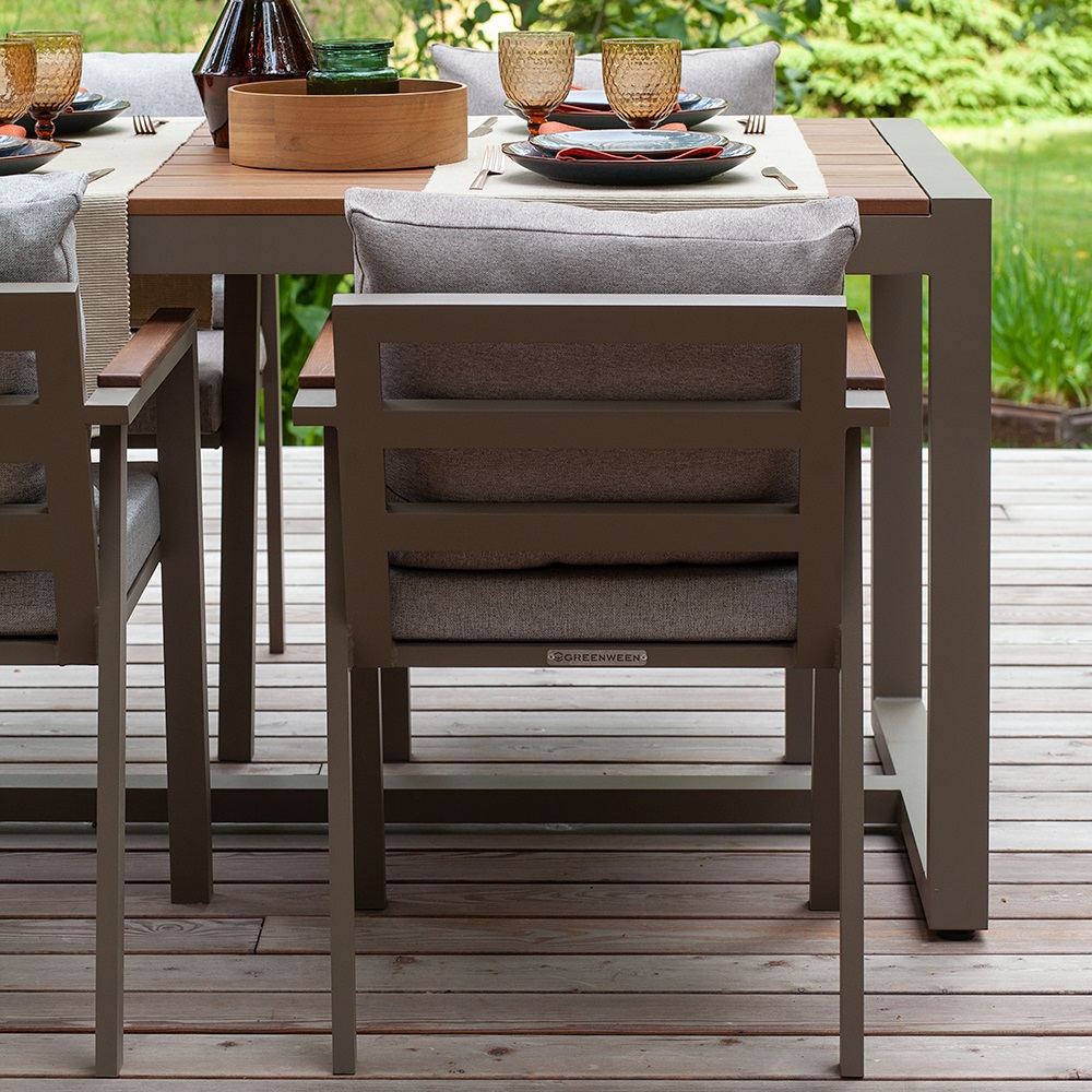 Каркас изготовлен из прочного алюминия, столешница и подлокотники — из массива лиственницы, а стулья дополнены мягкими подушками.
