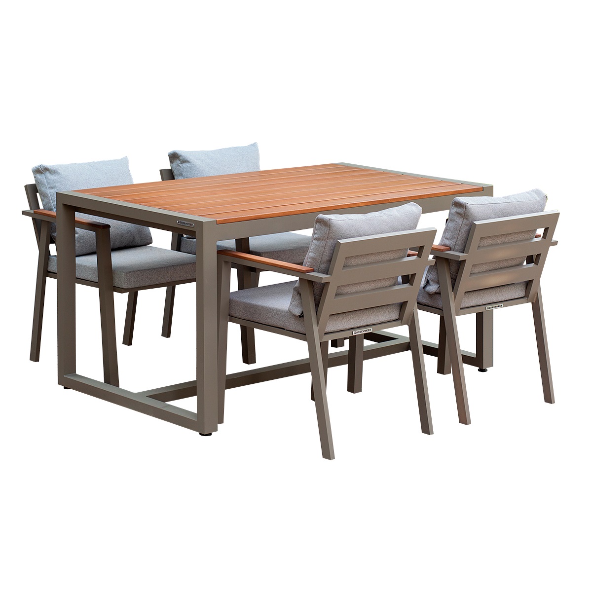 Коллекция садовой мебели SANTORINI славится своим элегантным дизайном и долговечностью. Уличный комплект включает в себя большой обеденный стол и четыре удобных стула. Каркас из высокопрочного алюминия окрашен в теплый оттенок пекан, а столешница и подлокотники выполнены из массива лиственницы.