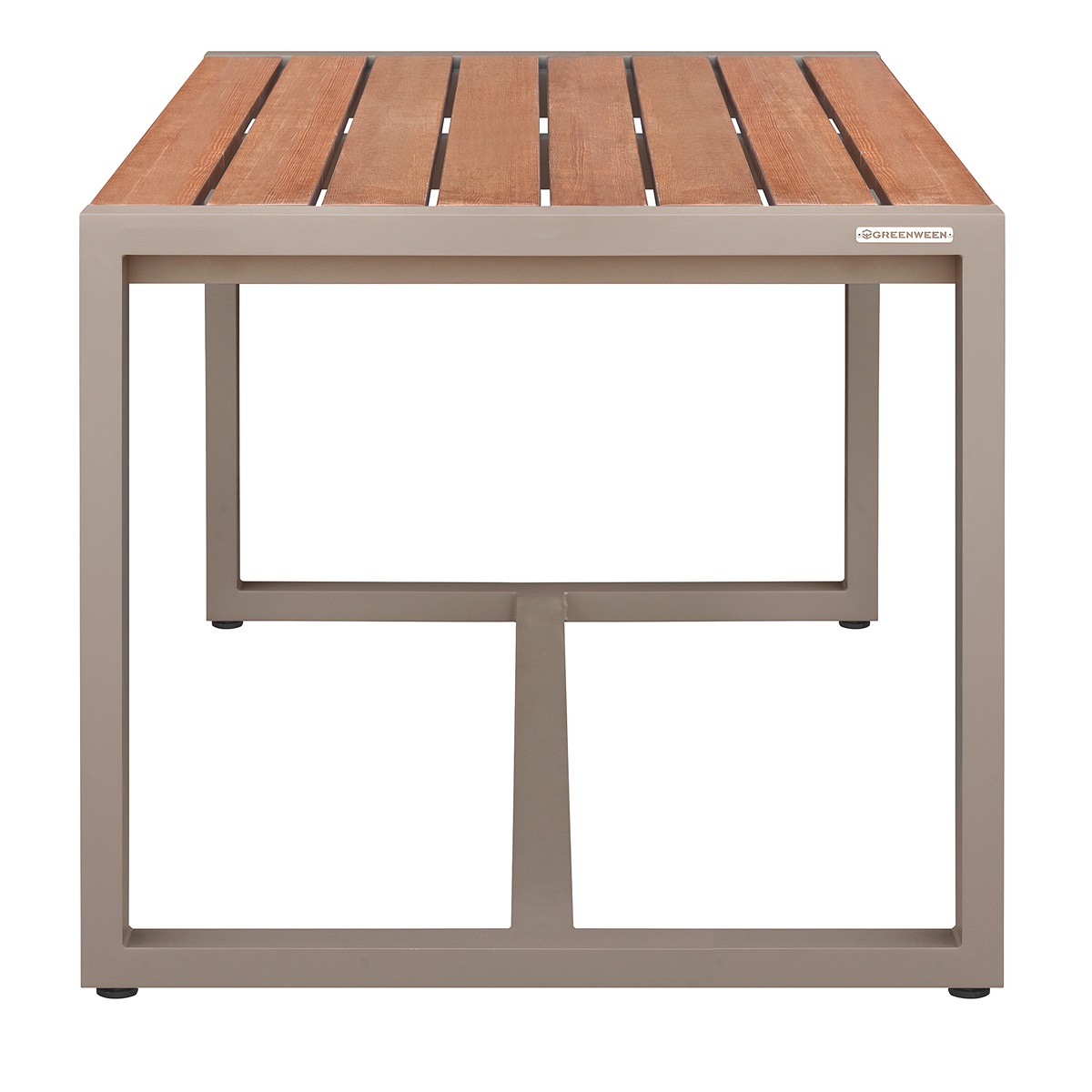 Столешница и подлокотники из массива лиственницы толщиной 20 мм покрыты защитным маслом, что делает их устойчивыми к внешним воздействиям. Натуральная текстура дерева на изделии дарит приятные тактильные ощущения.