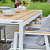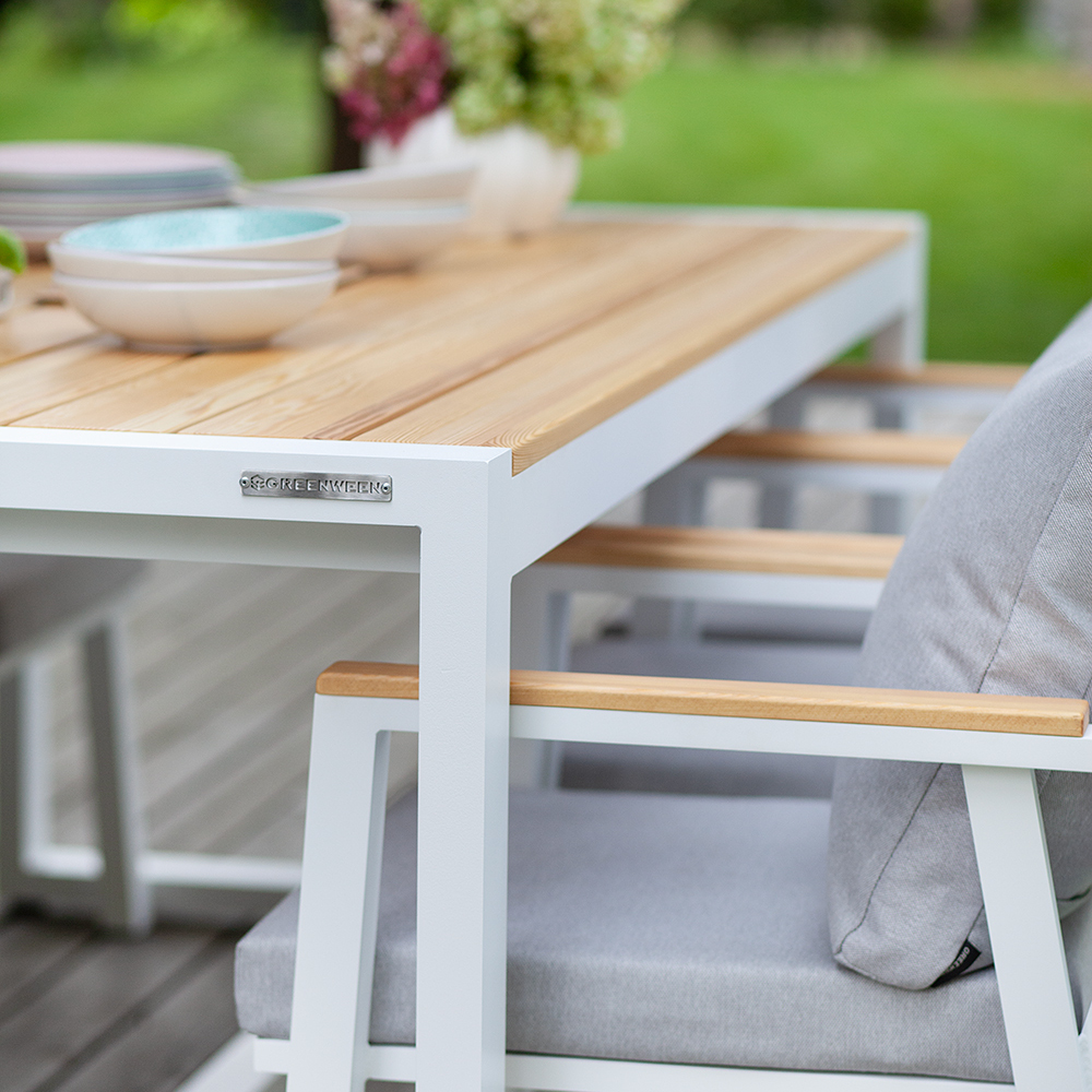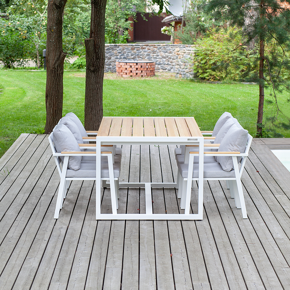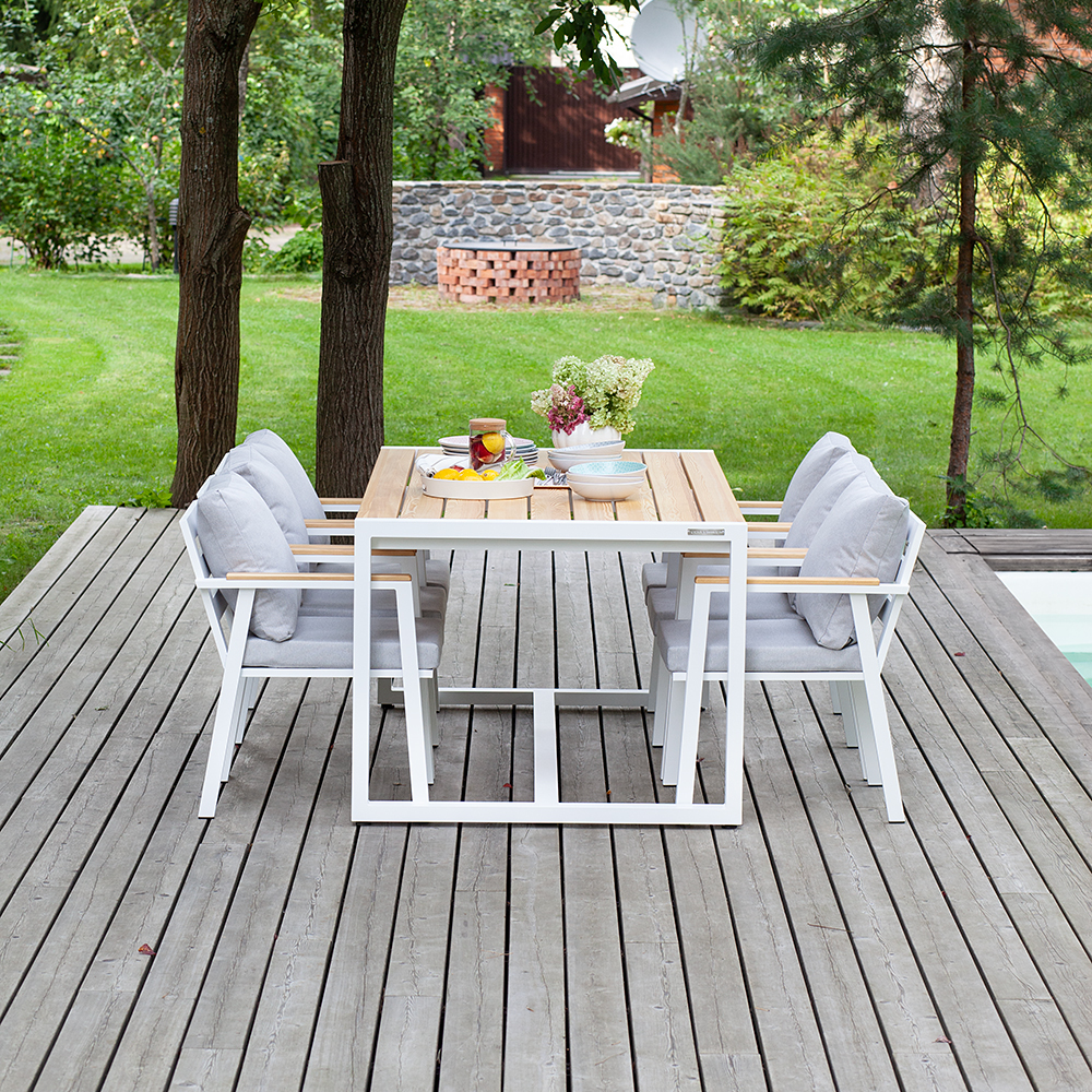 В уличном комплекте SANTORINI представлены большой обеденный стол и 6 удобных стульев. Каркас мебели изготовлен из высокопрочного алюминия с полимерным покрытием белого цвета. Столешница и подлокотники выполнены из массива лиственницы. Для комфортной посадки в комплекте идут мягкие подушки в съемных чехлах.
