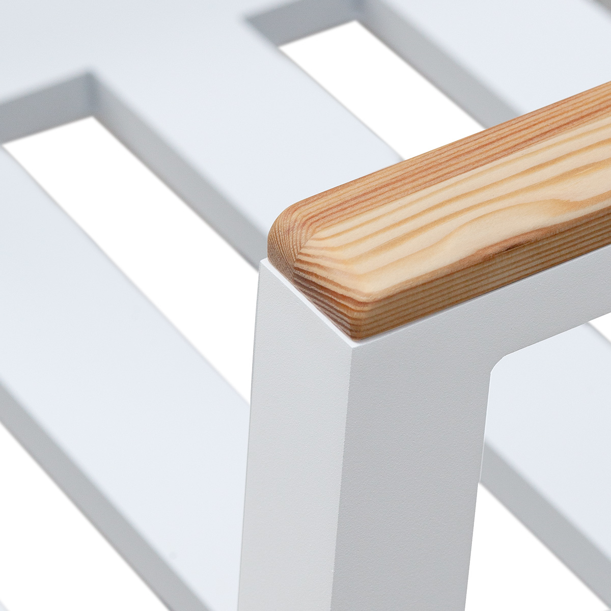 Столешница и подлокотники выполнены из массива лиственницы толщиной 20 мм, деревянные ламели покрыты защитным маслом, которое обеспечивает устойчивость к влиянию внешней среды. Теплая натуральная текстура дерева подарит комфорт и приятные тактильные ощущения.