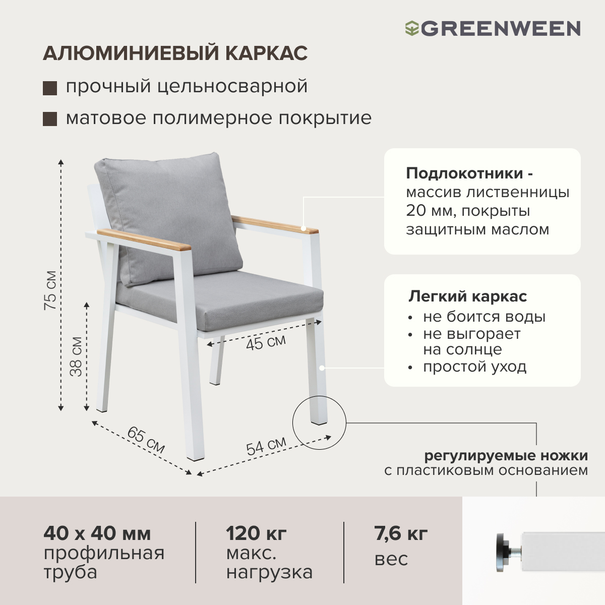 Каркас мебели изготовлен из алюминиевой профильной трубы. Металлическое основание с матовым полимерным покрытием отличается повышенной прочностью, устойчивостью к царапинам. Профессиональная порошковая покраска обеспечивает долговечность и легкость в уходе. Современное производство Greenween гарантирует надежность и эстетику сварных швов металлической мебели.
