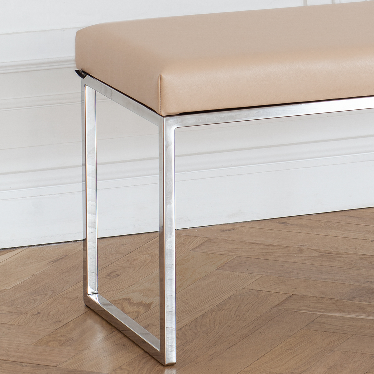 Банкетка ALBA с каркасом из нержавеющей стали и мягкой обивкой из экокожи привлекает внимание стильным дизайном и комфортом. Она идеально впишется в прихожую, спальню, гостиную, гардеробную или кабинет.