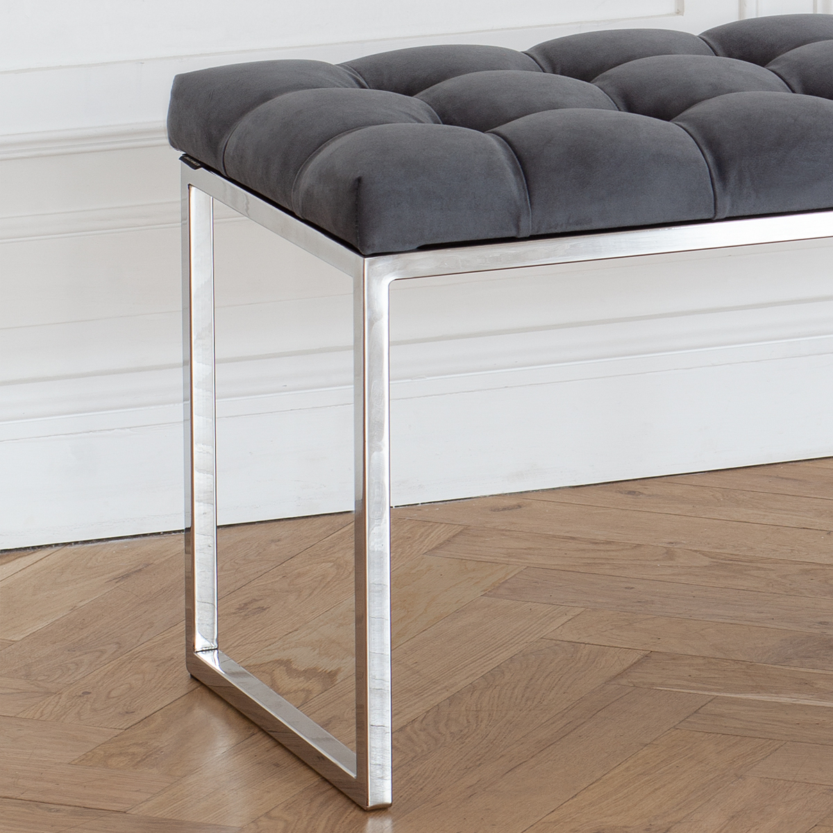 Банкетка ALBA с каркасом из нержавеющей стали и мягкой обивкой из микрошенилла в каретной стяжке привлекает внимание стильным дизайном и комфортом. Она идеально впишется в прихожую, спальню, гостиную, гардеробную или кабинет.