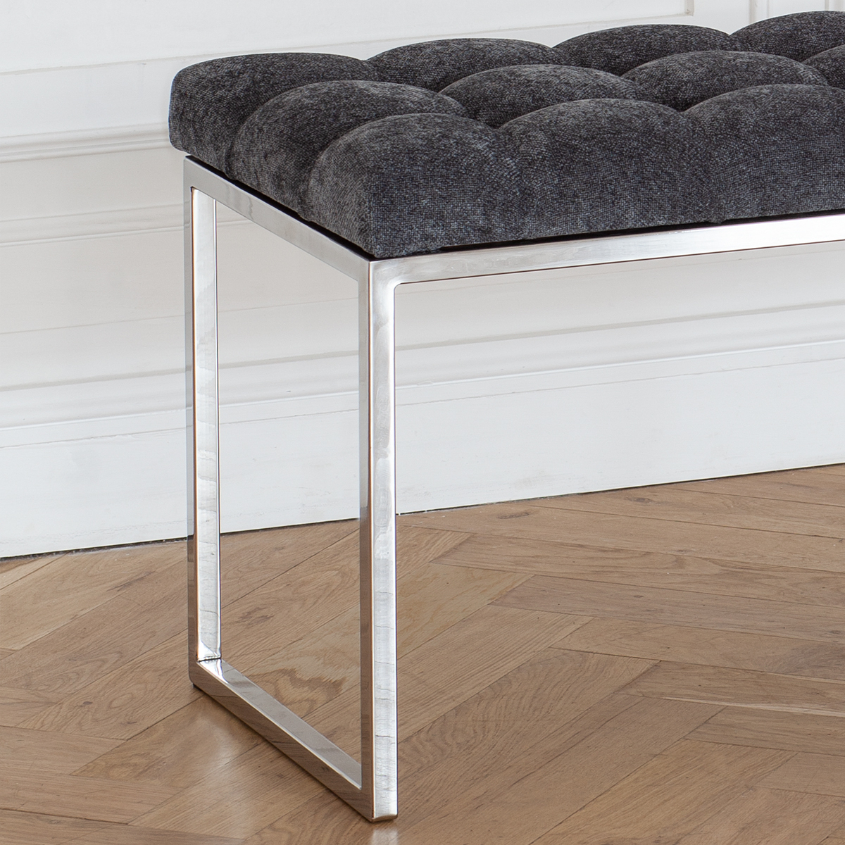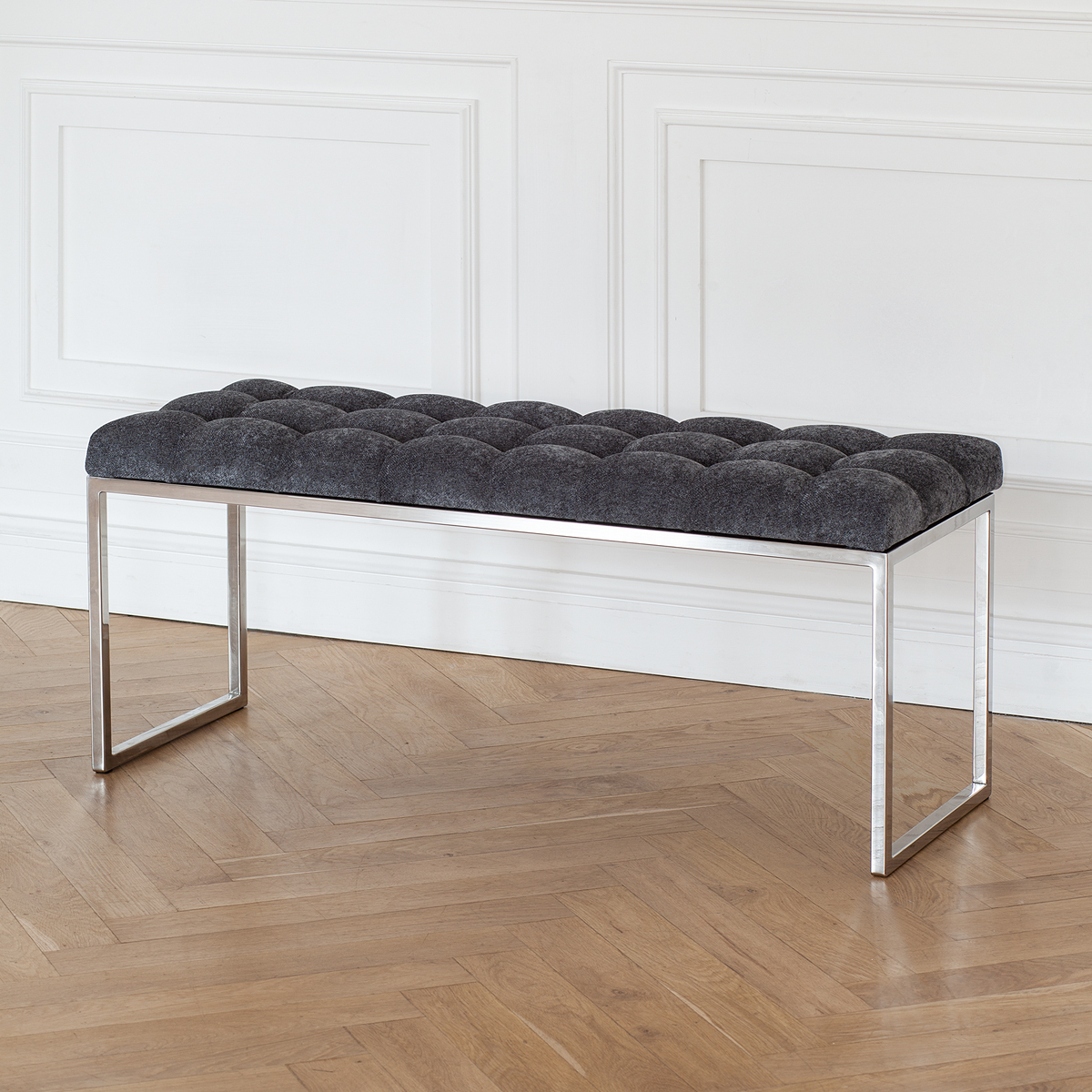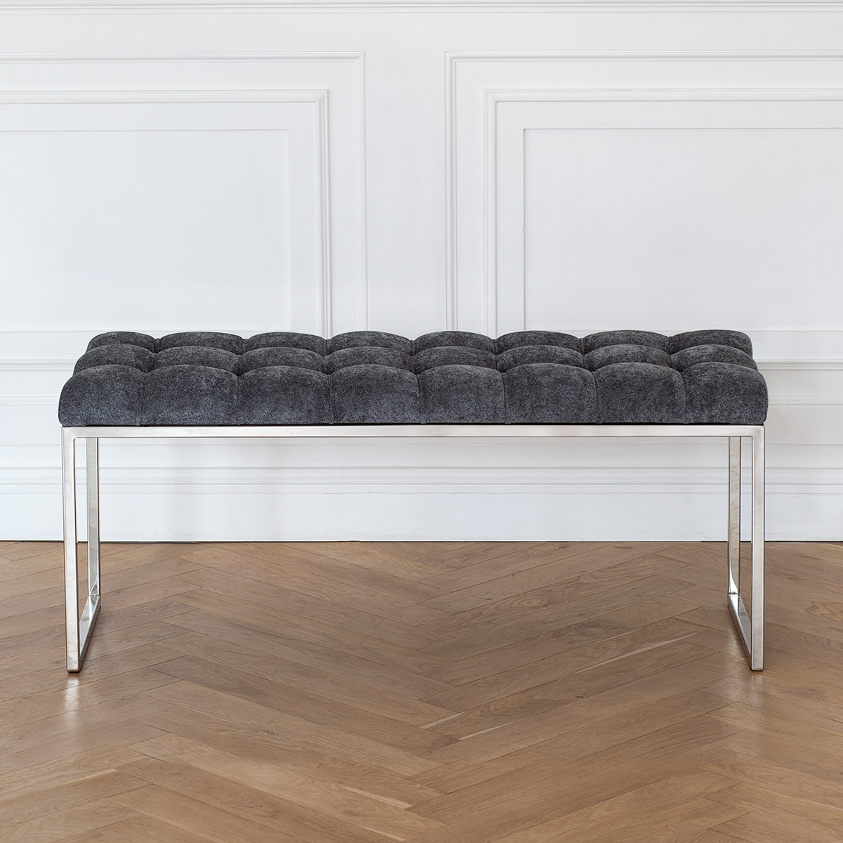 Банкетка ALBA с каркасом из нержавеющей стали и мягкой обивкой из микрошенилла в каретной стяжке привлекает внимание стильным дизайном и комфортом. Она идеально впишется в прихожую, спальню, гостиную, гардеробную или кабинет.