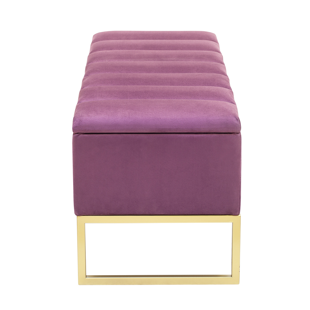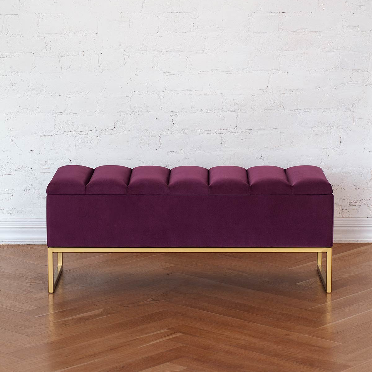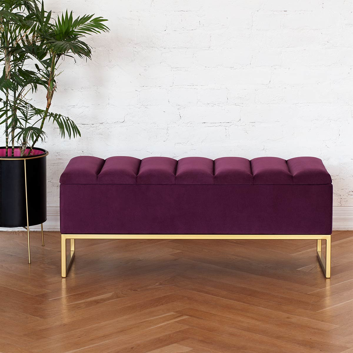 Банкетка CUBE с золотым основанием, мягкой велюровой подушкой в стяжке Bulon и ящиком для хранения — это стильное и функциональное решение для вашего интерьера.