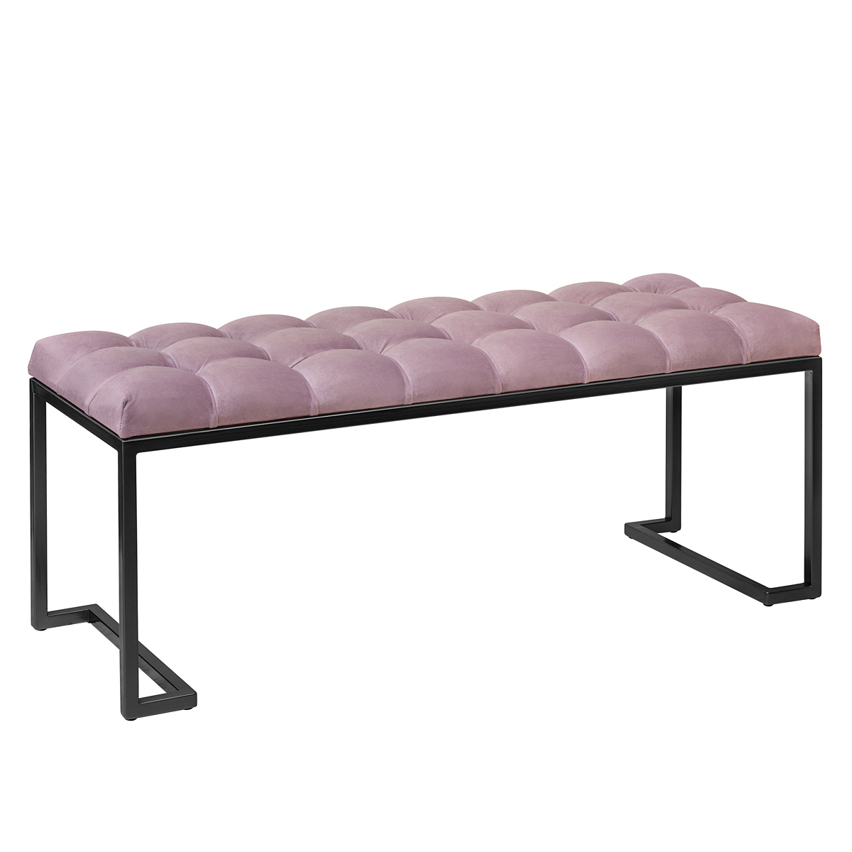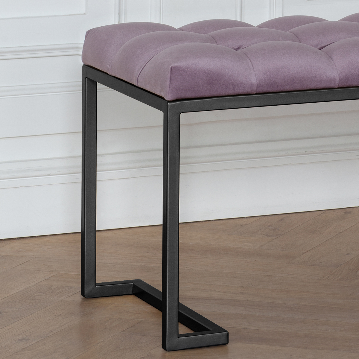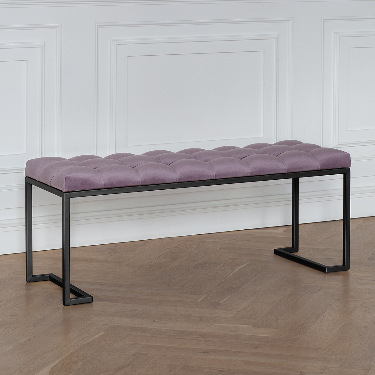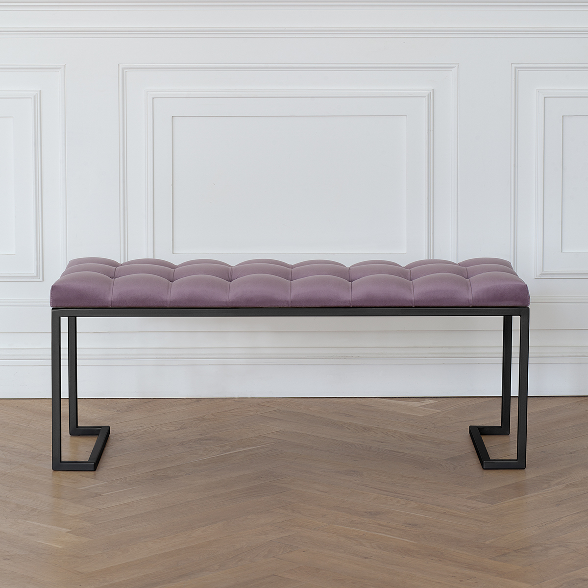 Банкетка OMEGA с черным основанием и мягкой велюровой подушкой в каретной стяжке.