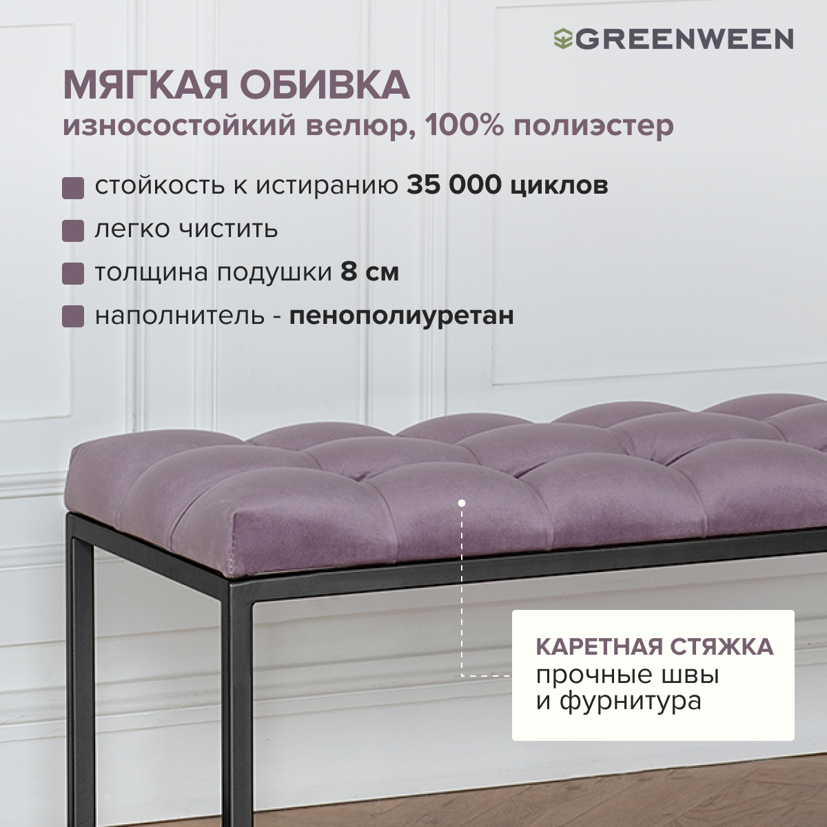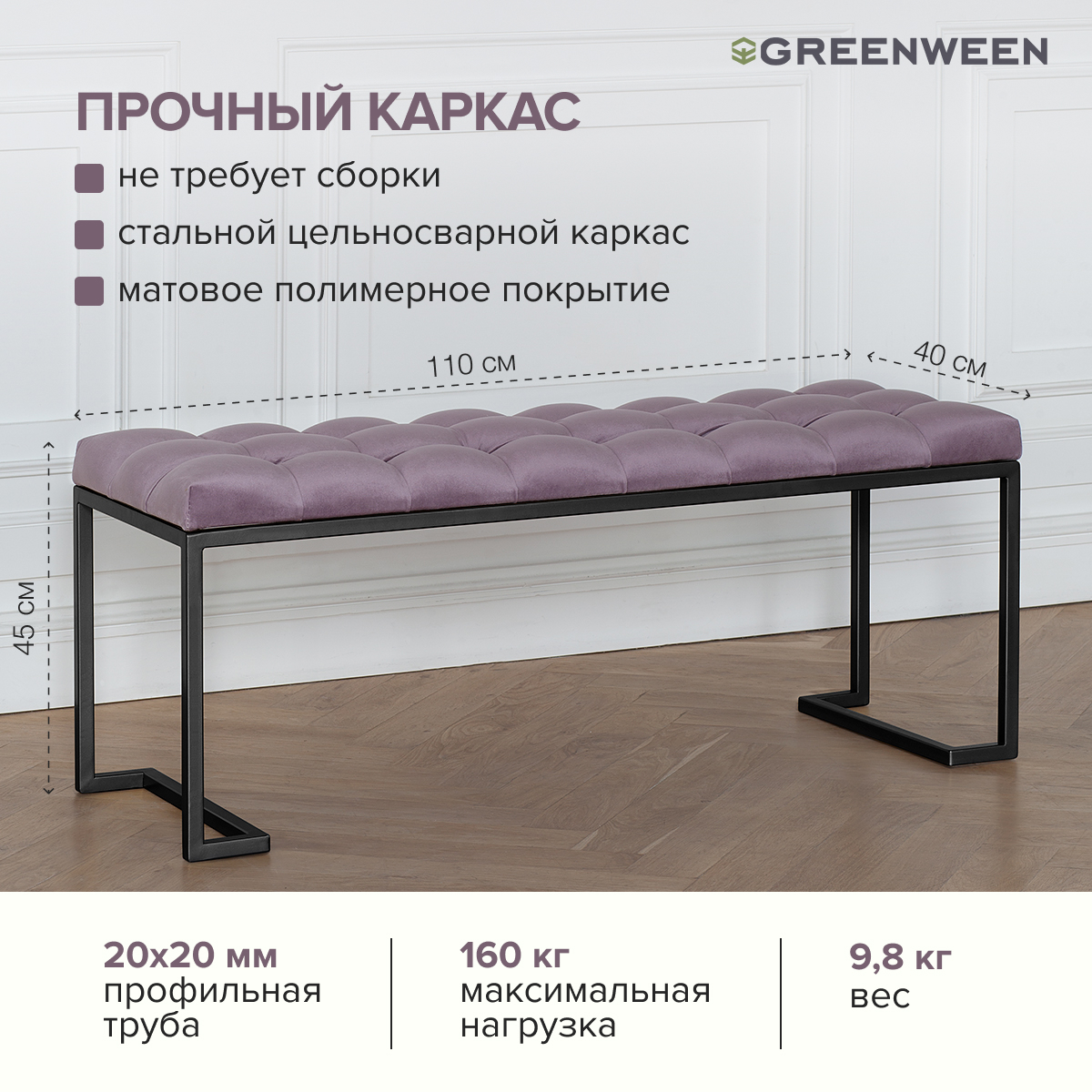 Основание банкетки сделано из стали с полимерным покрытием. Наше собственное производство GreenWeen гарантирует надежность и эстетичность сварных швов металлической мебели.