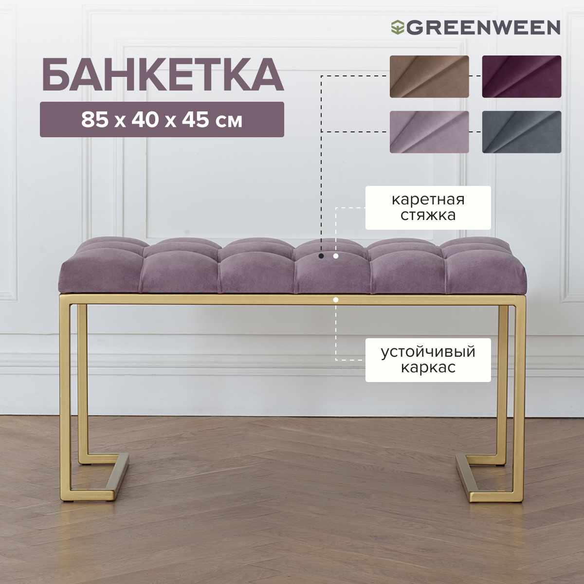 Банкетка OMEGA MINI — это элегантное и практичное решение для вашего интерьера. Стальной каркас с золотым основанием и мягкая велюровая подушка в каретной стяжке создают стильный образ.