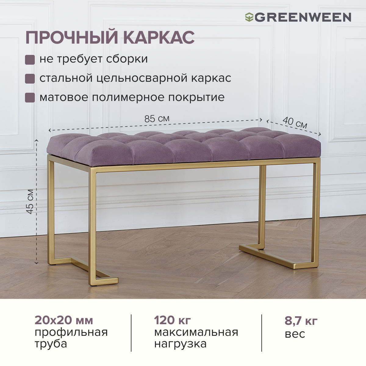 Основание банкетки сделано из стали с полимерным покрытием. Наше собственное производство GreenWeen гарантирует надежность и эстетичность сварных швов металлической мебели.