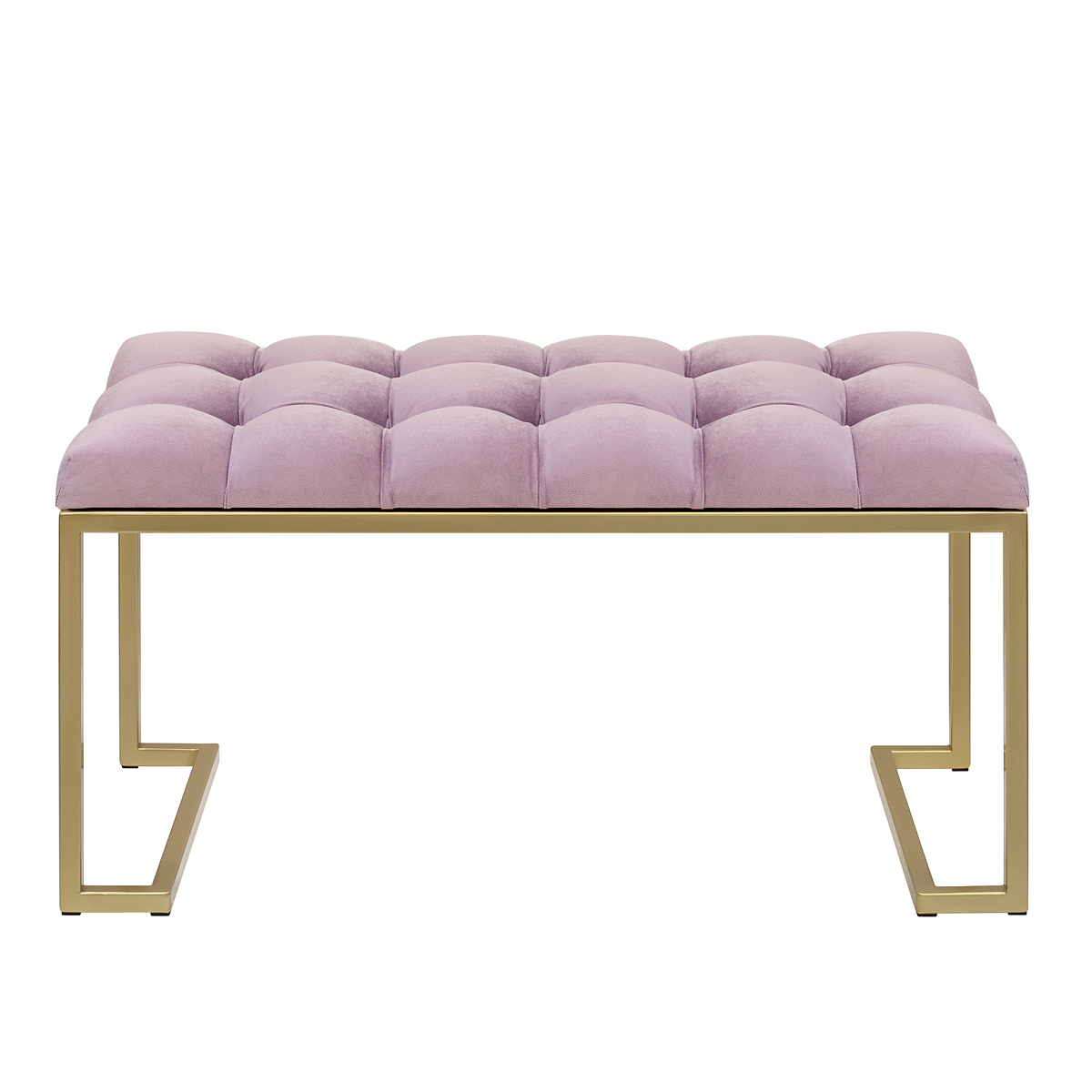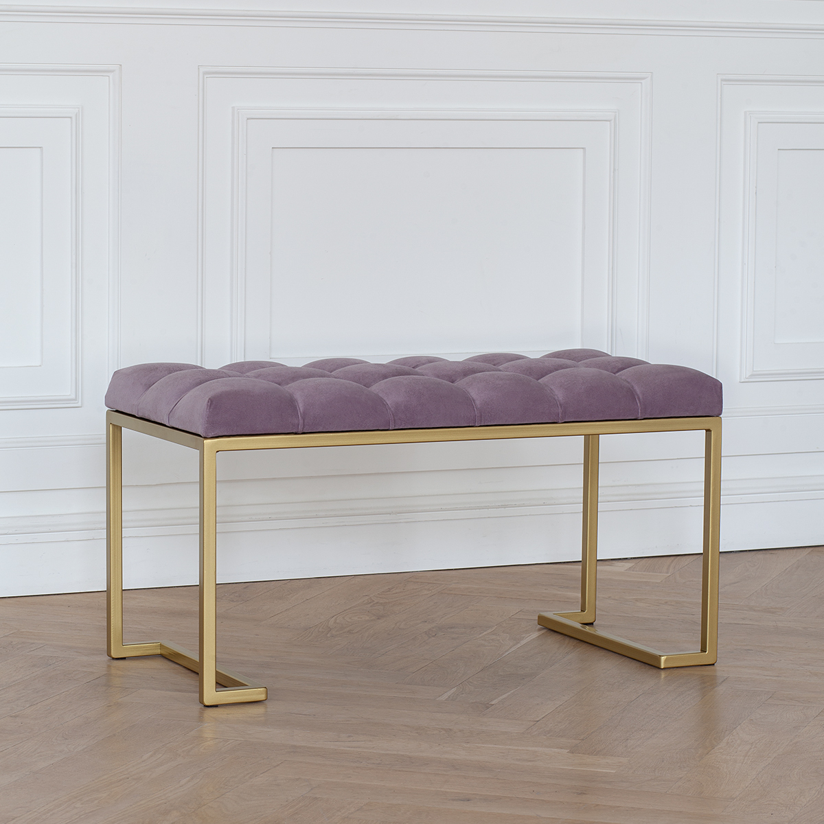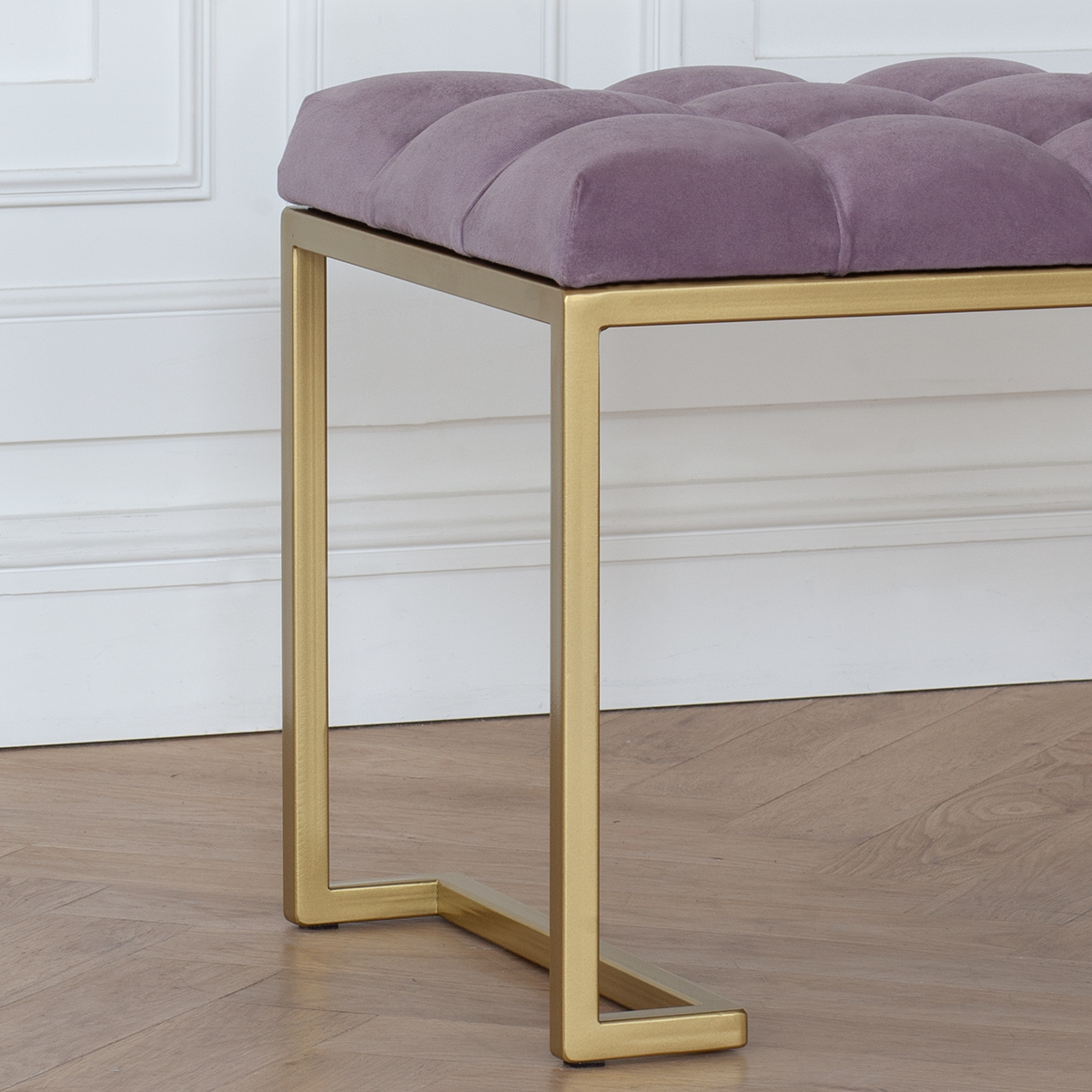 Банкетка OMEGA MINI с золотистым основанием и мягкой велюровой подушкой в каретной стяжке.