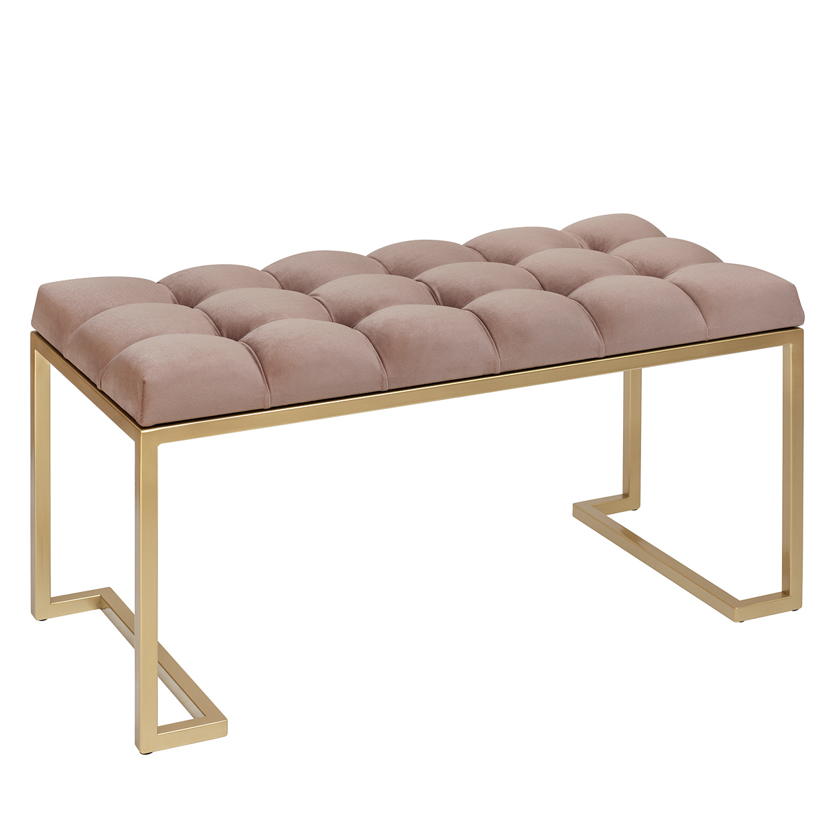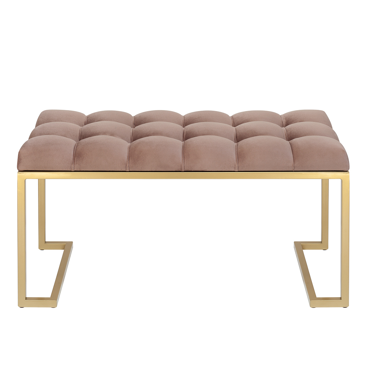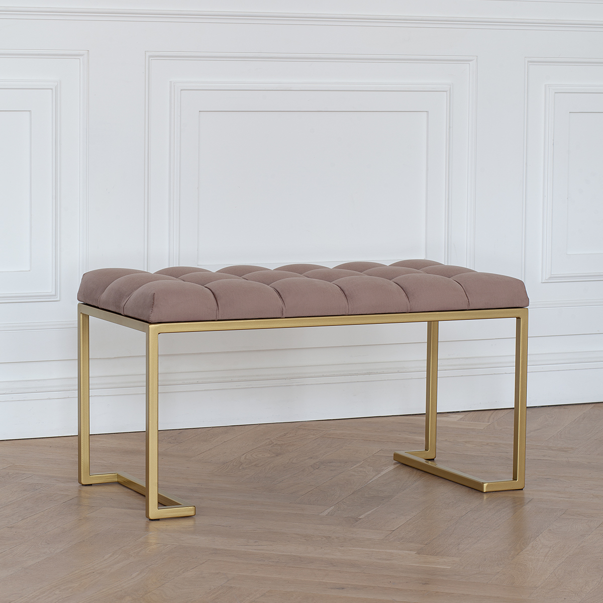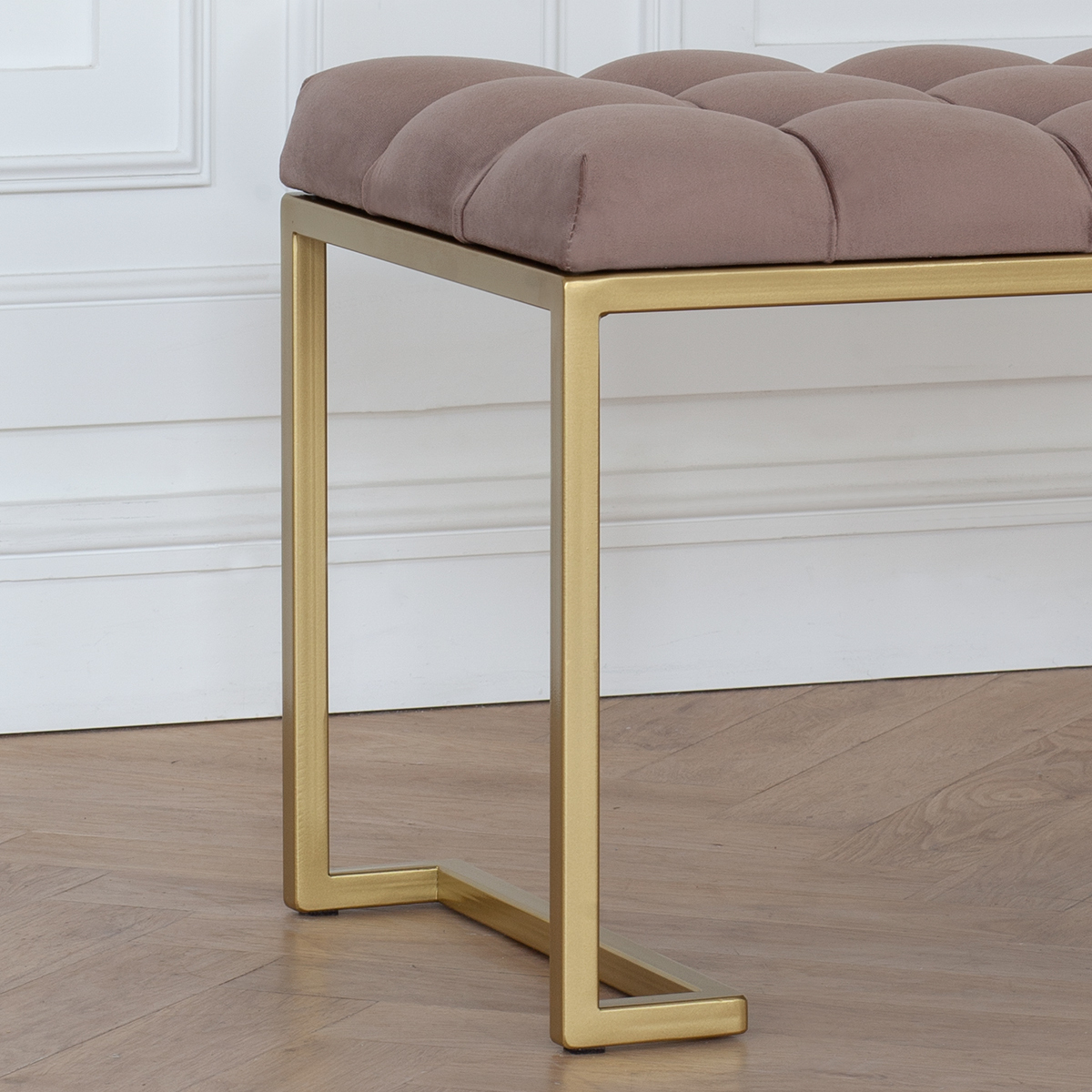 Банкетка OMEGA MINI с золотым основанием и мягкой велюровой подушкой в каретной стяжке.