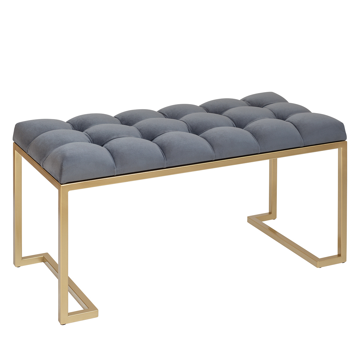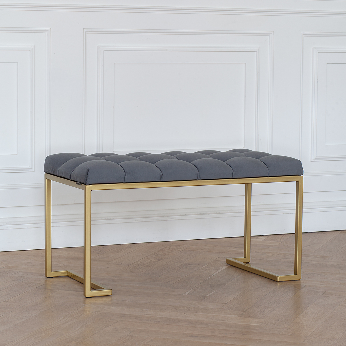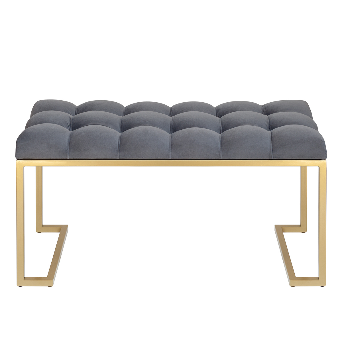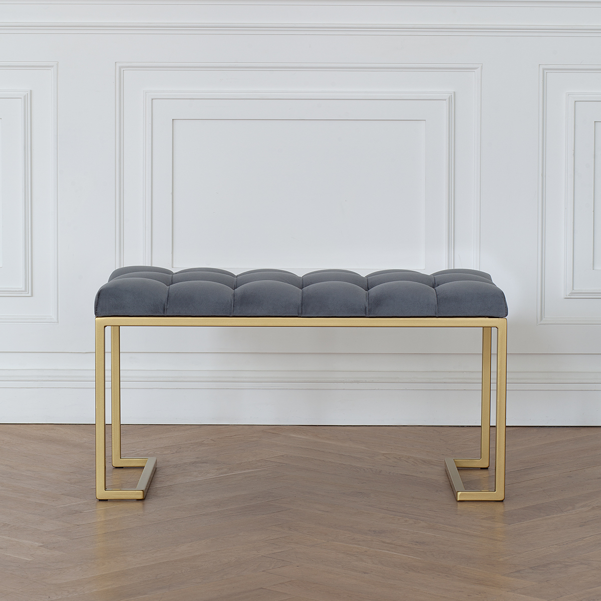 Банкетка OMEGA MINI с золотым основанием и мягкой велюровой подушкой в каретной стяжке.