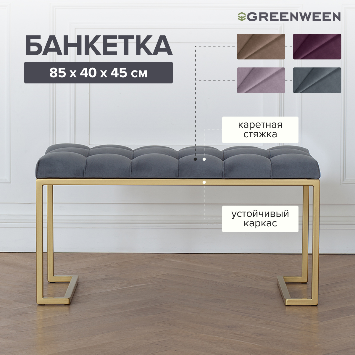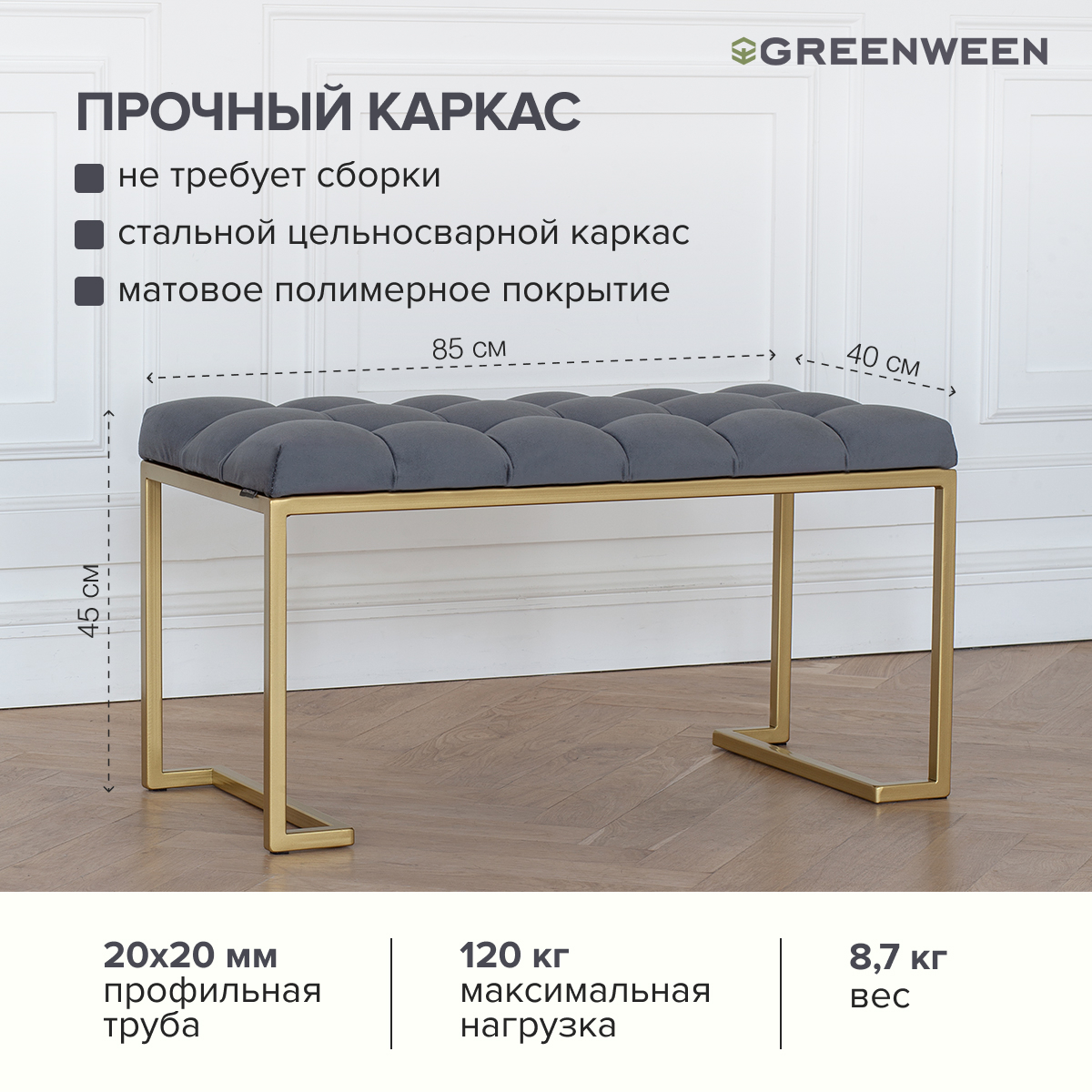 Основание банкетки сделано из стали с полимерным покрытием. Наше собственное производство GreenWeen гарантирует надежность и эстетичность сварных швов металлической мебели.