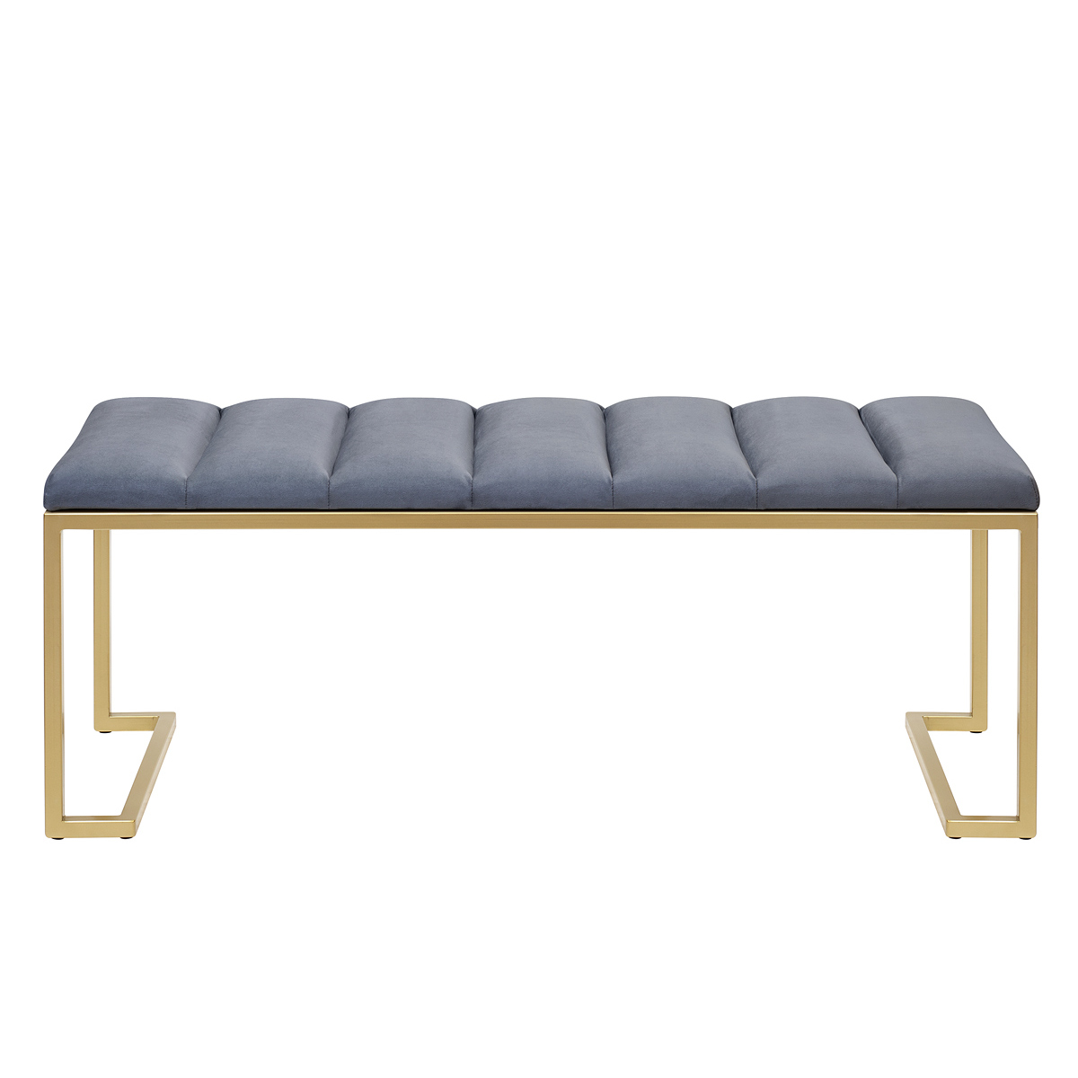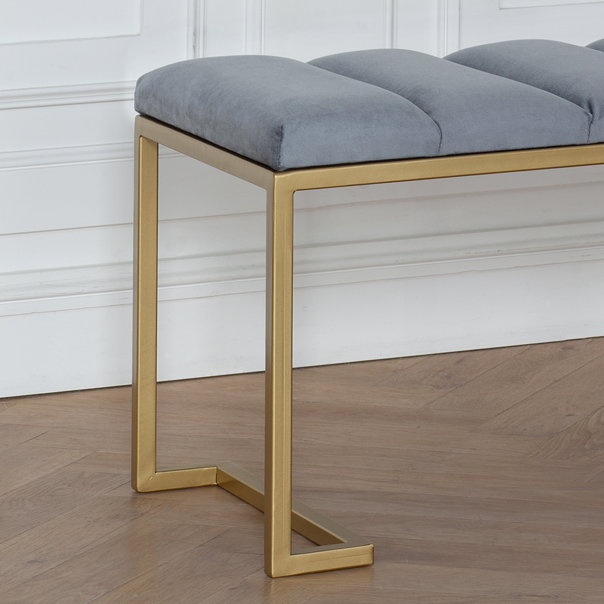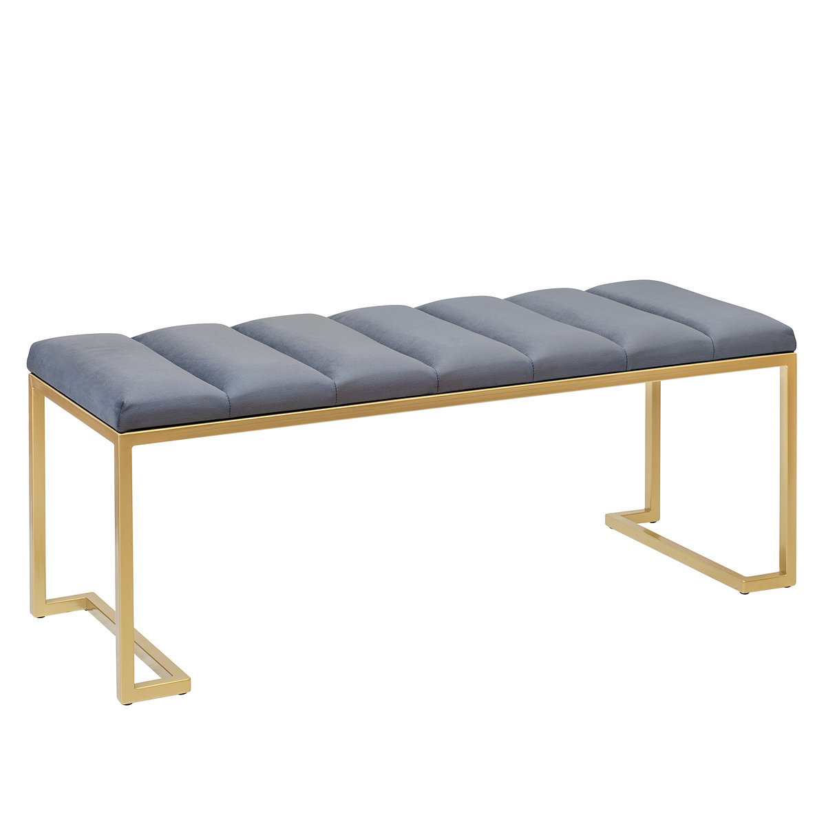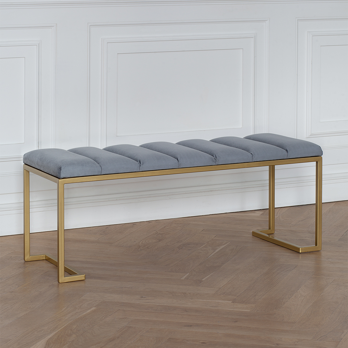 Банкетка OMEGA с золотистым основанием и мягкой велюровой подушкой в стяжке Bulon.