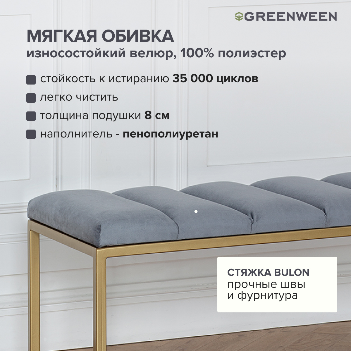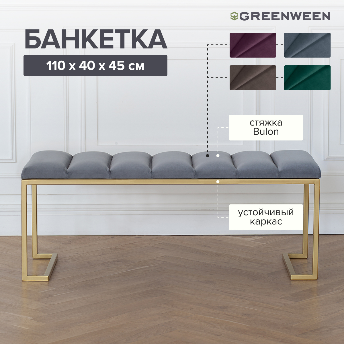 Основание банкетки сделано из стали с полимерным покрытием. Наше собственное производство GreenWeen гарантирует надежность и эстетичность сварных швов металлической мебели.