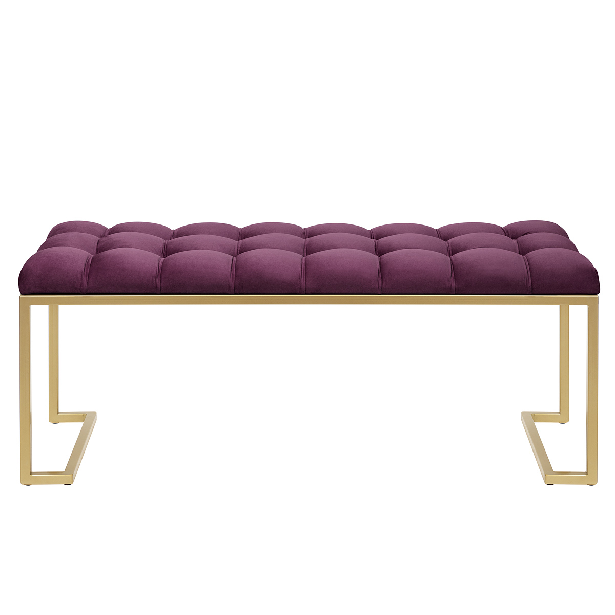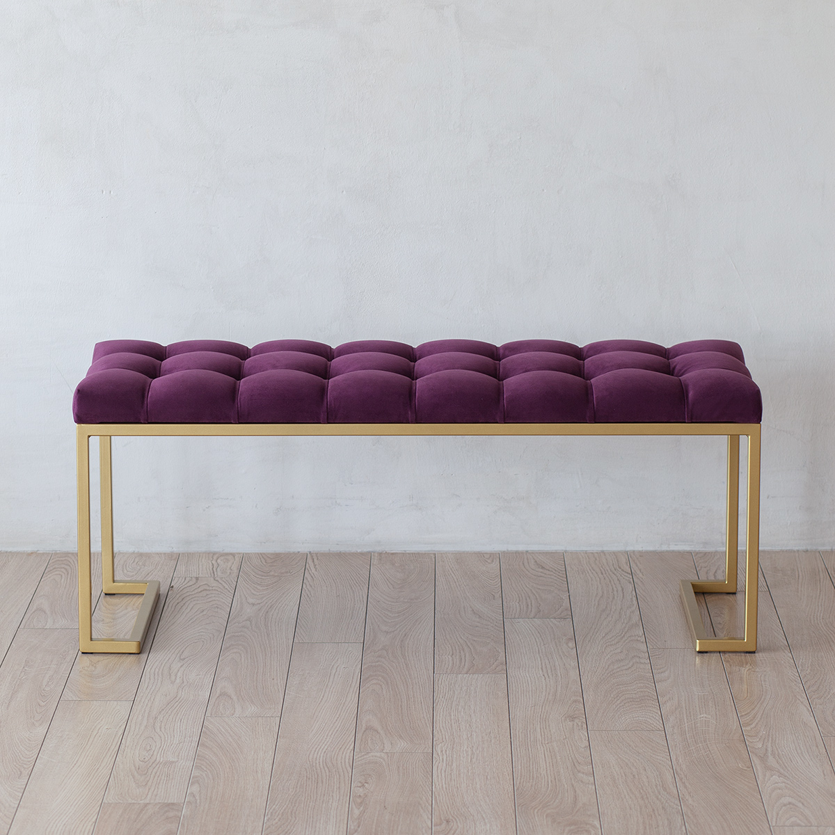Банкетка OMEGA с золотистым основанием и мягкой велюровой подушкой в каретной стяжке.