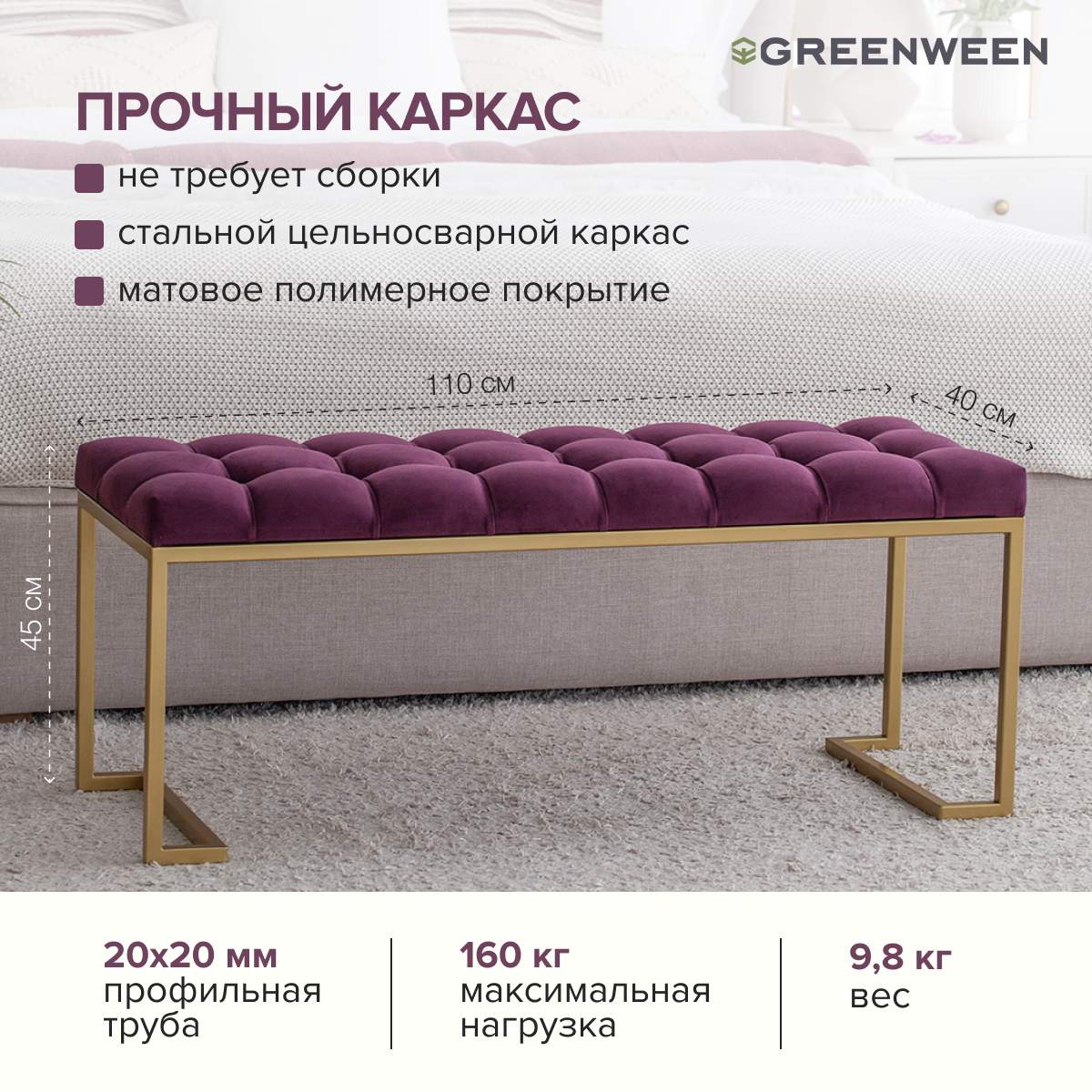 Основание банкетки сделано из стали с полимерным покрытием. Наше собственное производство GreenWeen гарантирует надежность и эстетичность сварных швов металлической мебели.