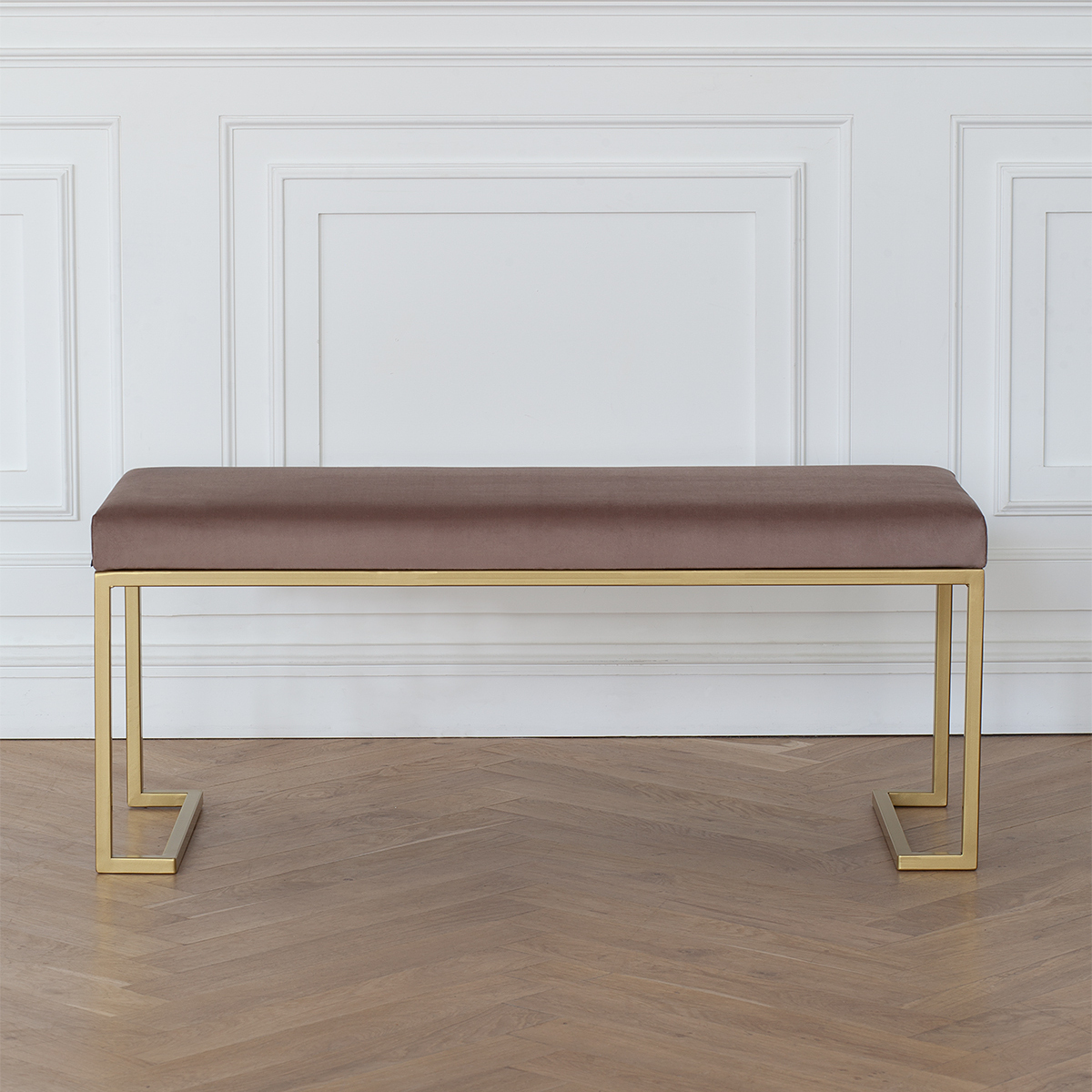Банкетка OMEGA с золотым основанием и мягкой велюровой подушкой.
