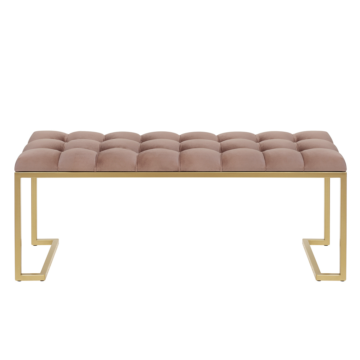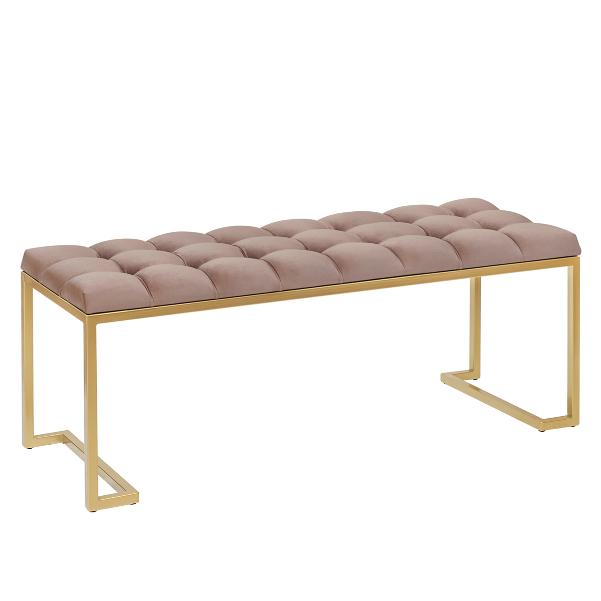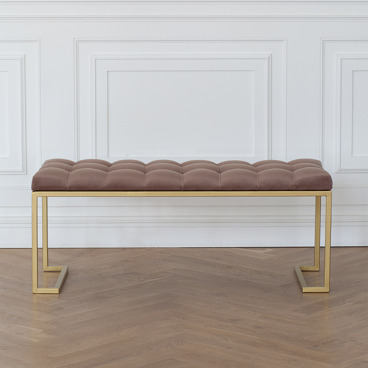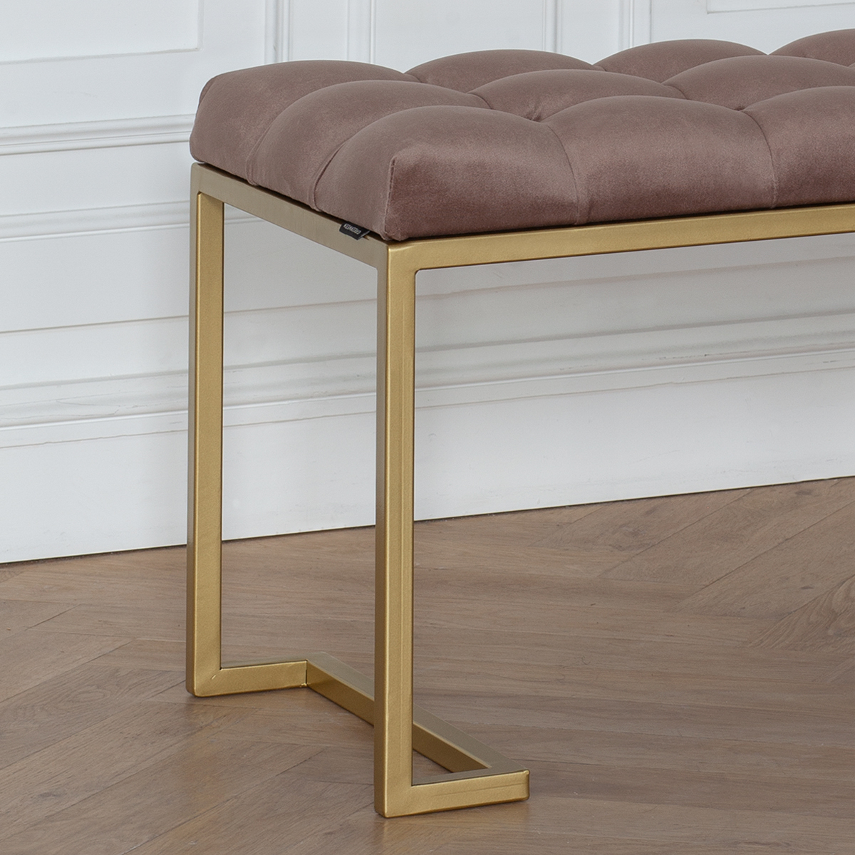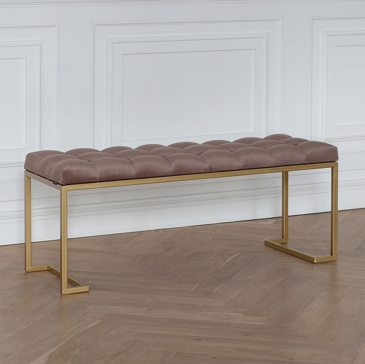 Банкетка OMEGA с золотистым основанием и мягкой велюровой подушкой в каретной стяжке.
