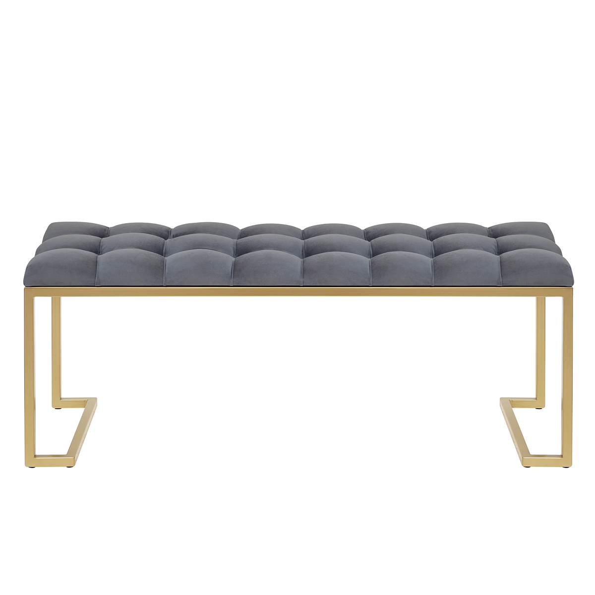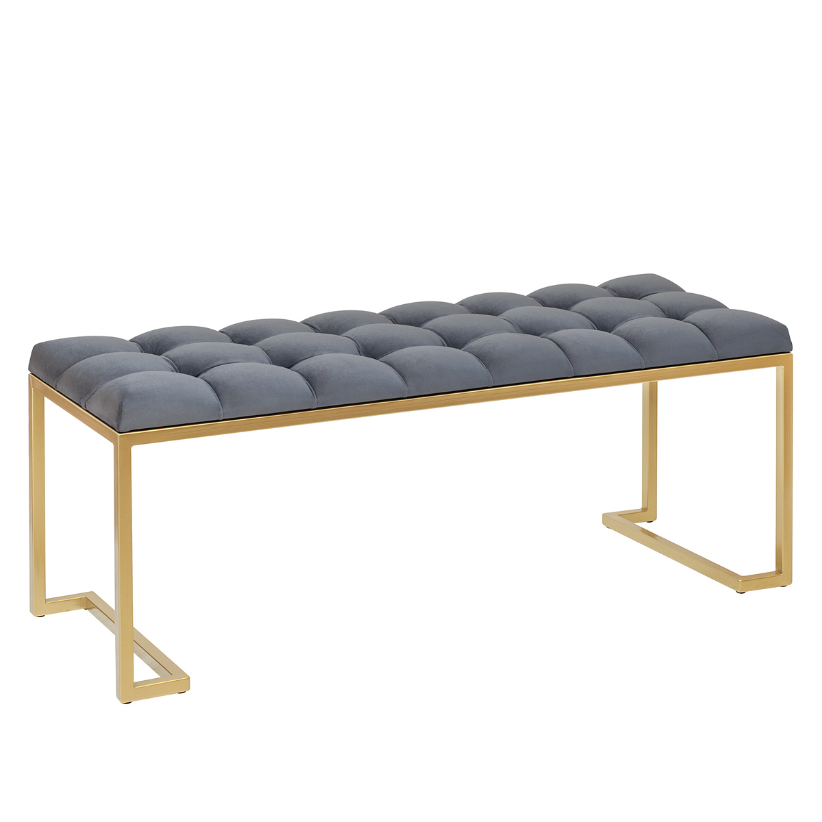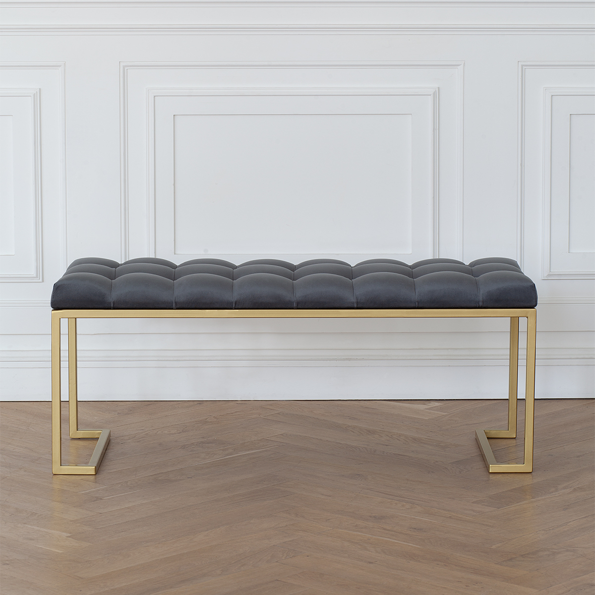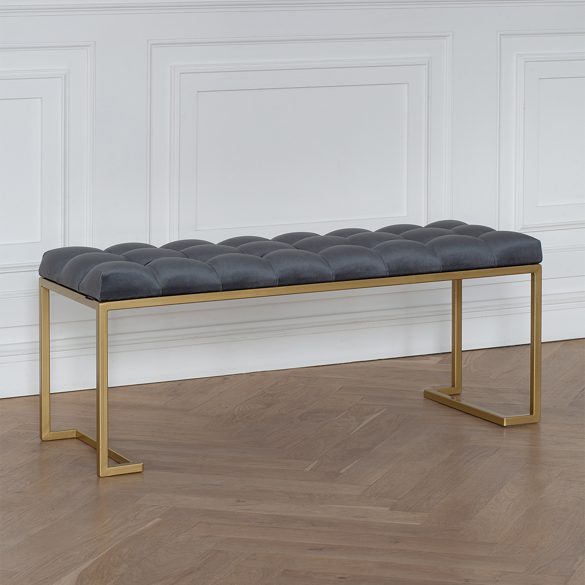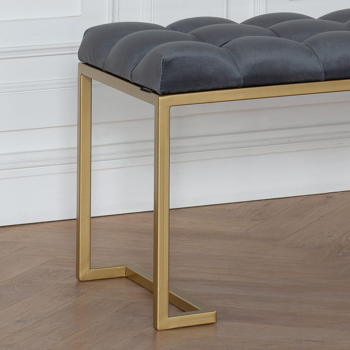 Банкетка OMEGA с золотистым основанием и мягкой велюровой подушкой в каретной стяжке.