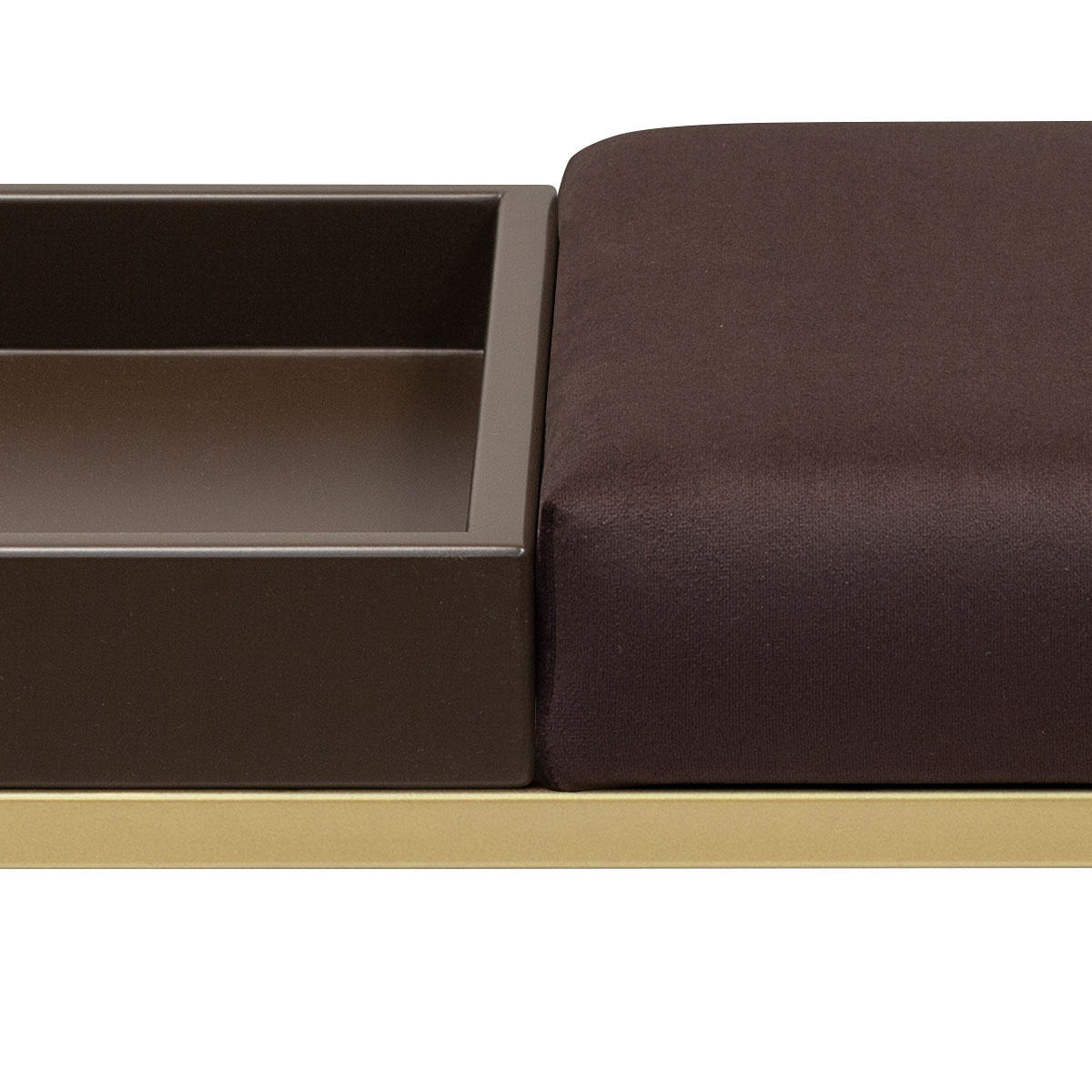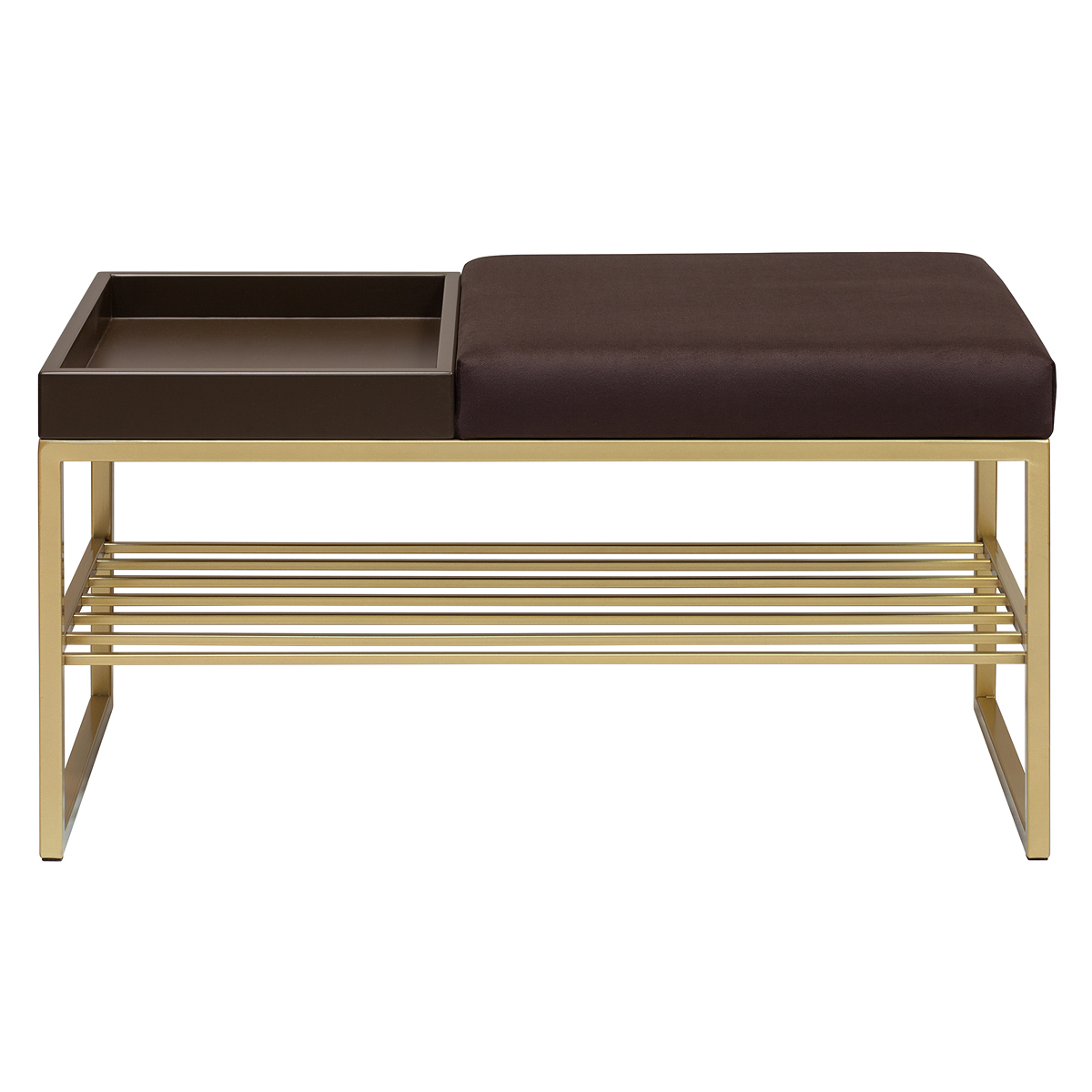 Банкетка RUBY BOX — это стильный и функциональный предмет мебели. У нее золотое основание, мягкое сиденье и удобные полки для обуви и аксессуаров.