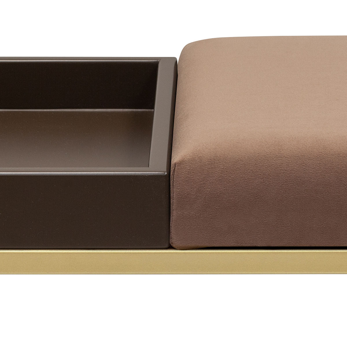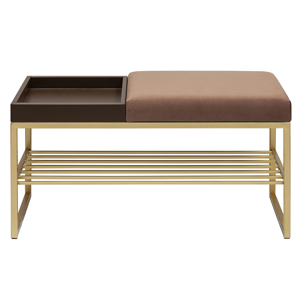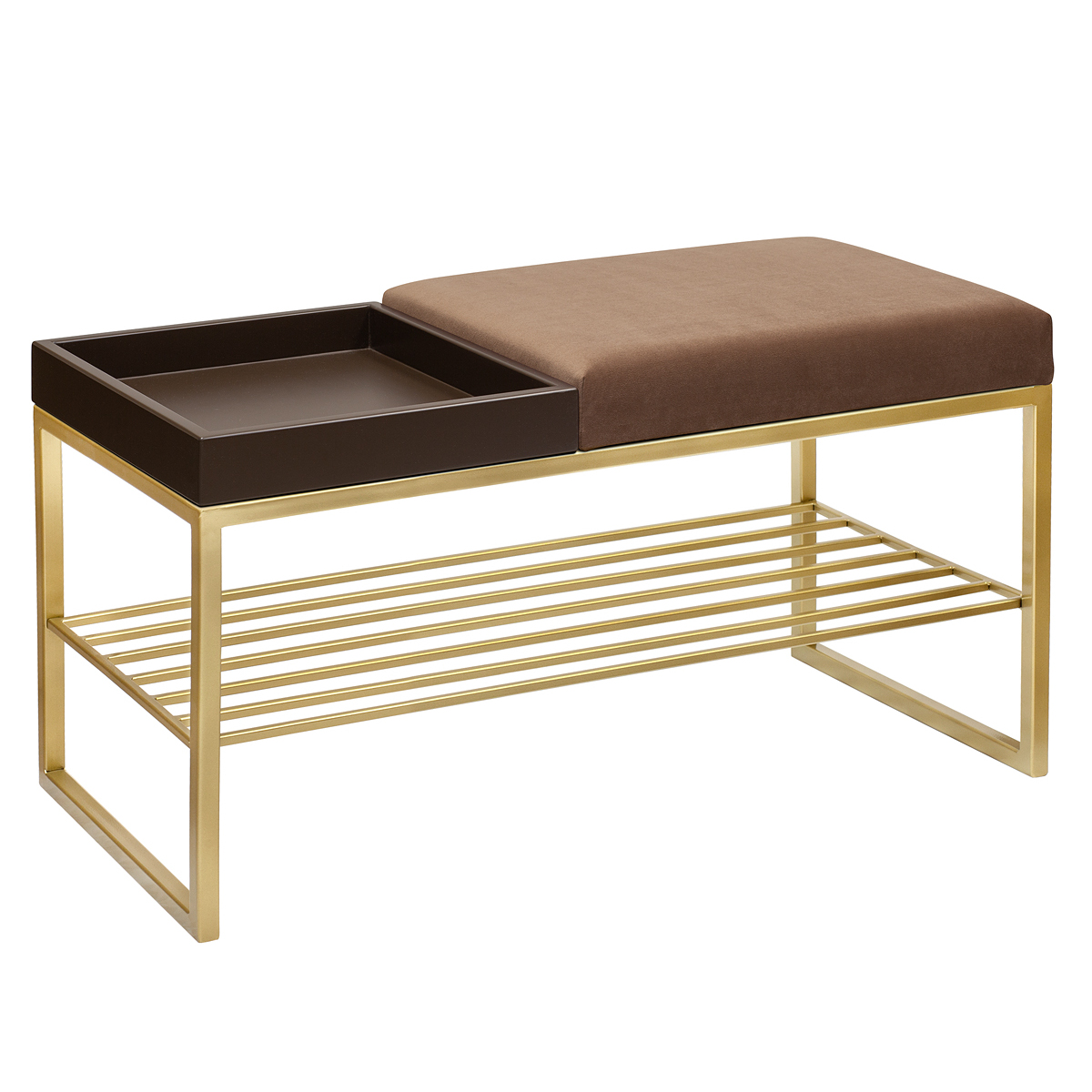 Банкетка RUBY BOX — это стильный и функциональный предмет мебели. У нее золотое основание, мягкое сиденье и удобные полки для обуви и аксессуаров.