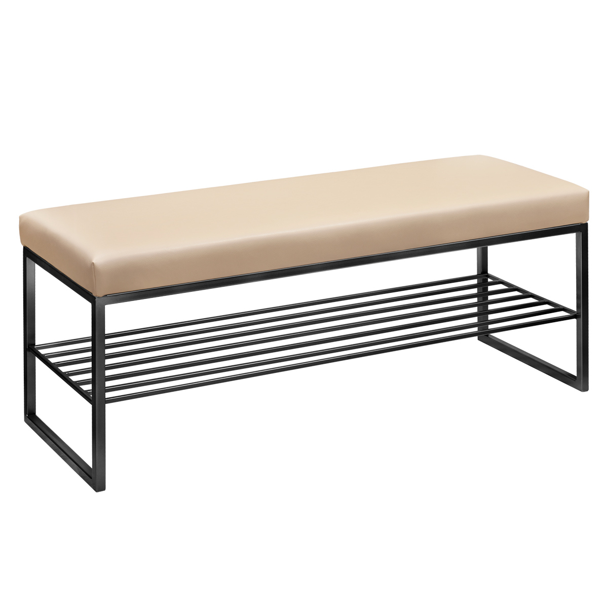 Размеры банкетки — 1100х400х450 мм. Каркас и полка для обуви выполнены из прочной профильной трубы. Мягкое сиденье обито искусственной кожей.
