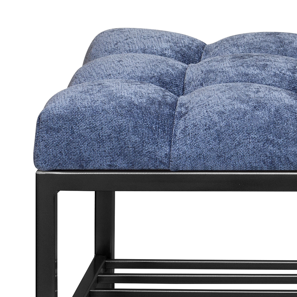 Размеры банкетки — 1100х400х450 мм. Каркас и полка для обуви выполнены из прочной профильной трубы. Мягкое сиденье обито микрошениллом в каретной стяжке.
