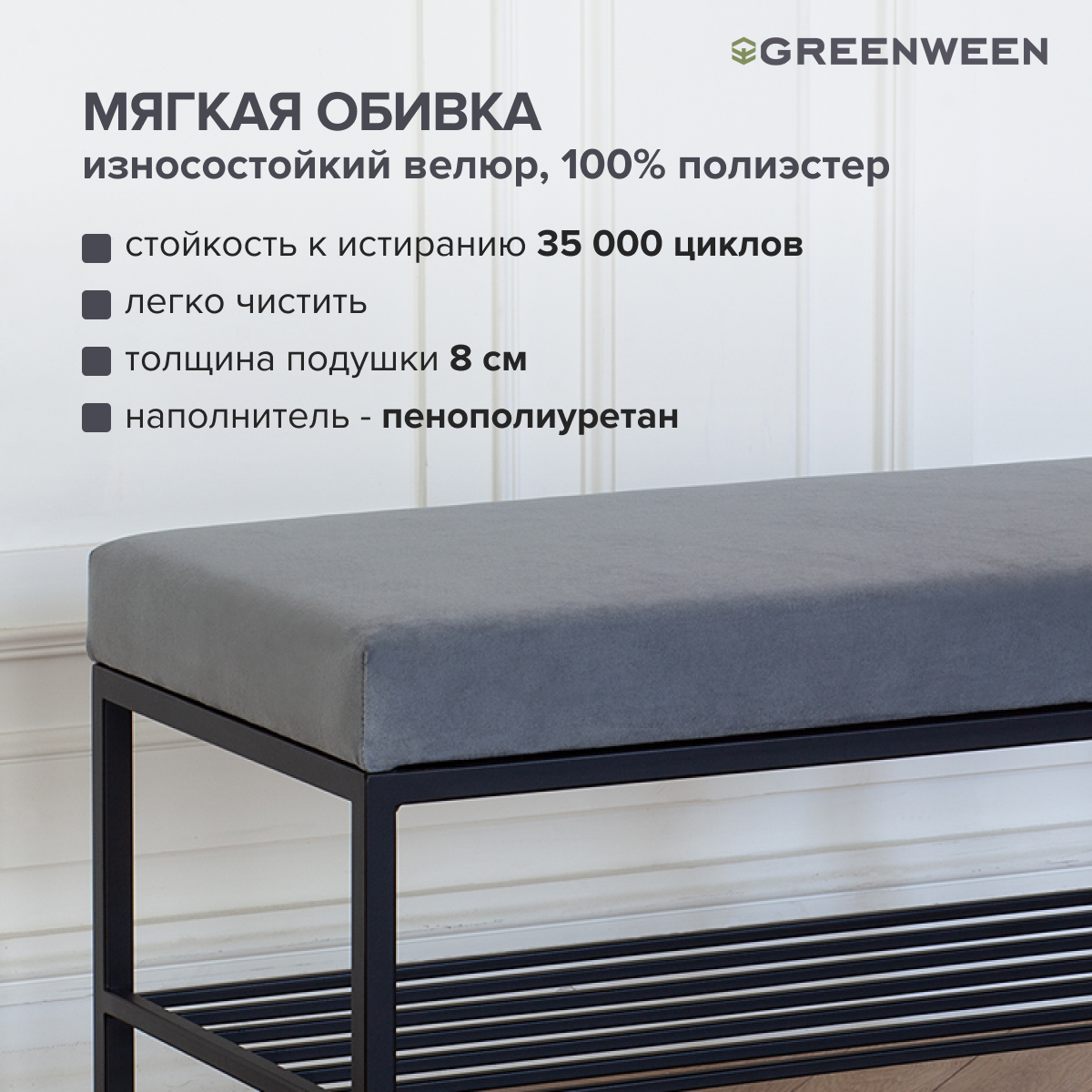 Банкетка RUBY MINI — это стильный и функциональный предмет мебели. У нее черное основание, мягкое сиденье и удобная полка для обуви.