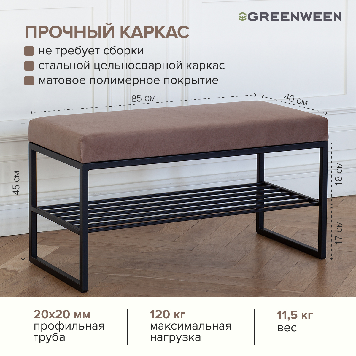 Основание банкетки изготовлено из стали с полимерным покрытием. Собственное производство GreenWeen обеспечивает надежность и эстетику сварных швов металлической мебели.