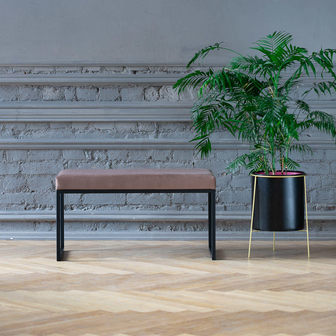 Банкетка RUBY MINI с черным основанием и мягкой велюровой подушкой.