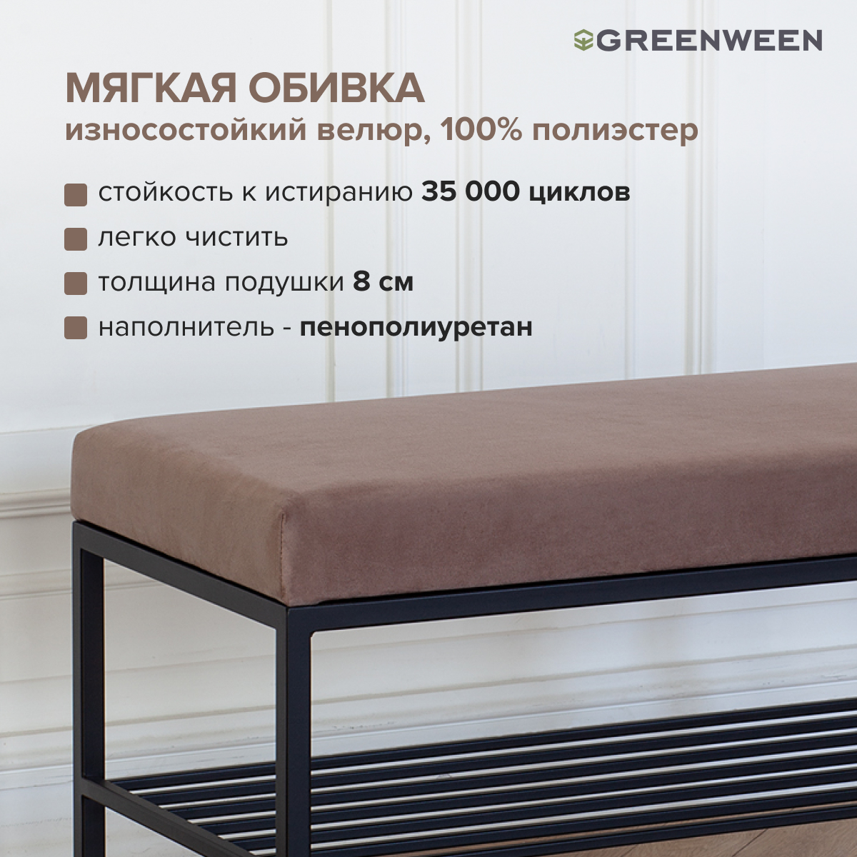 Банкетка с велюровой подушкой отличается элегантным видом и комфортной посадкой. Мягкая обивка с высокой износостойкостью, прошла тест Мартиндейла — 35 000 циклов. Бархатистая ткань легко чистится от загрязнений, для ухода разрешена сухая и влажная чистка.