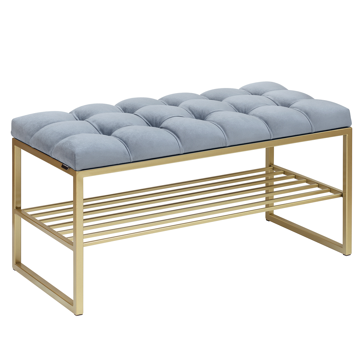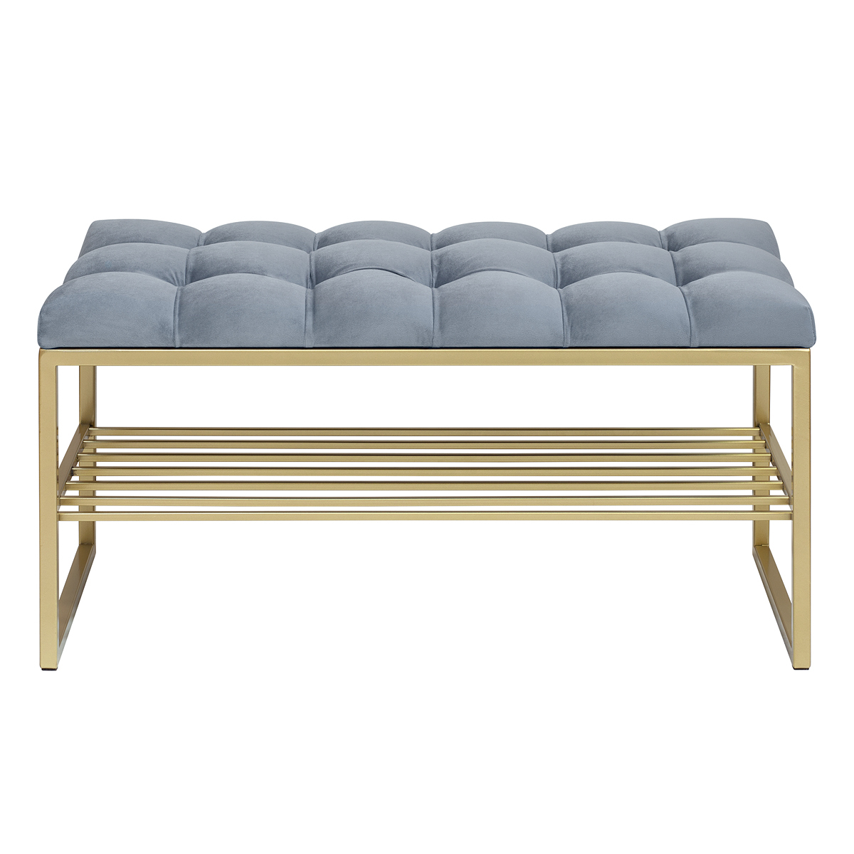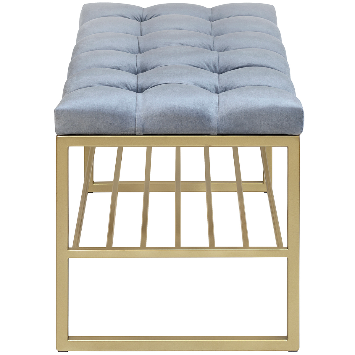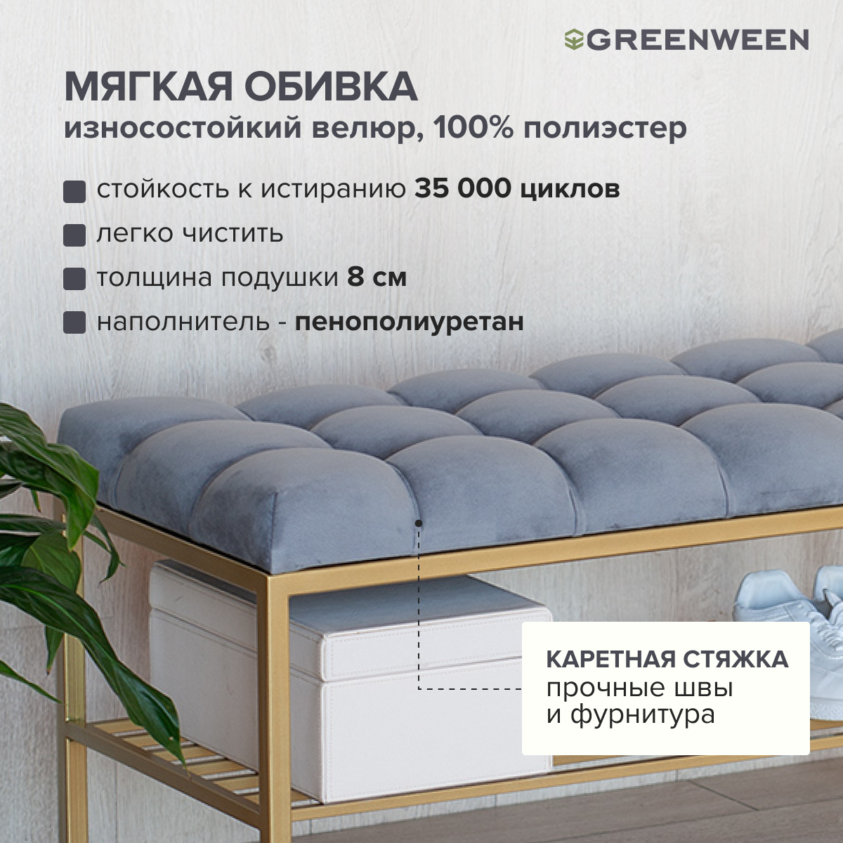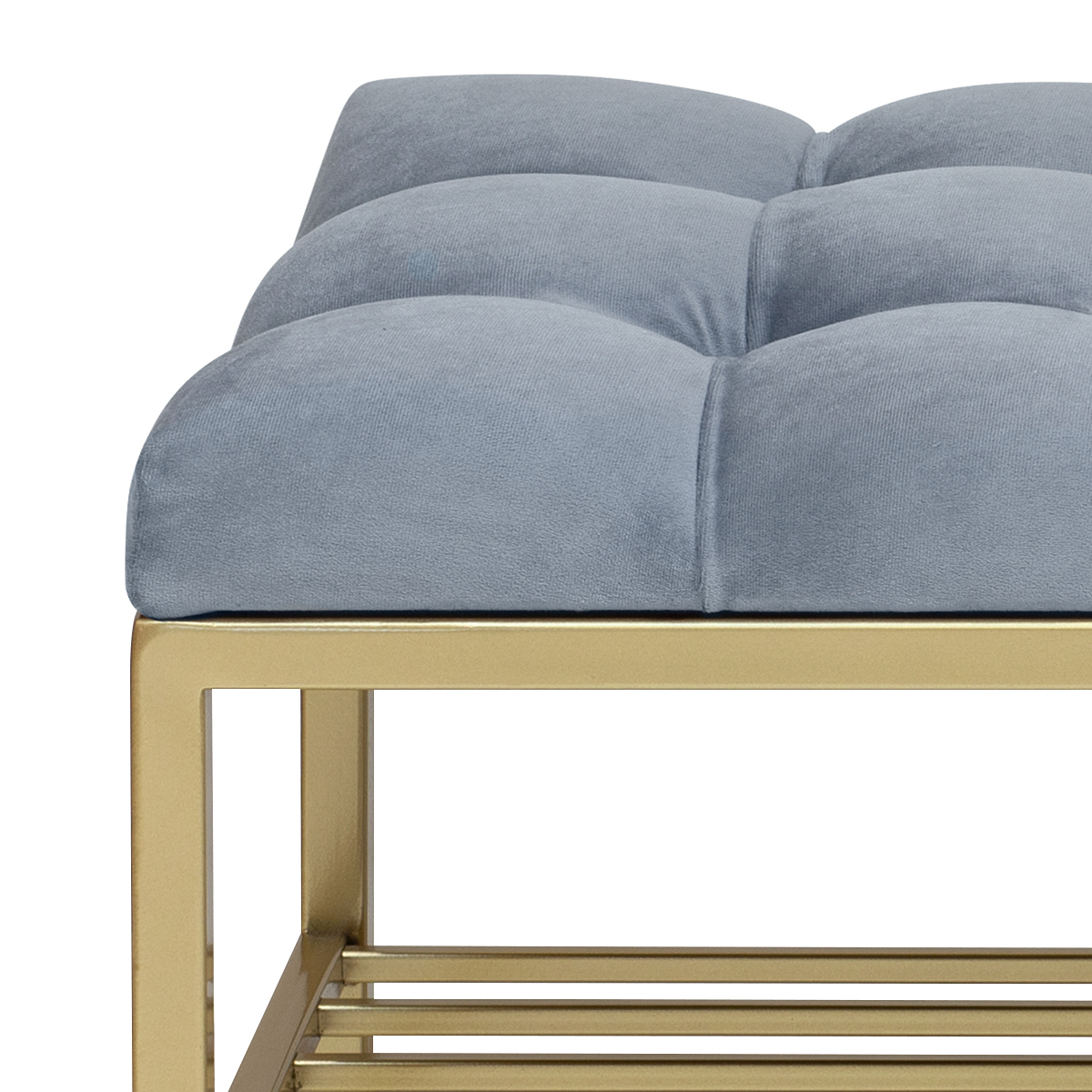 Банкетка RUBY MINI — это стильный и функциональный предмет мебели. У нее золотое основание, мягкое сиденье и удобная полка для обуви.