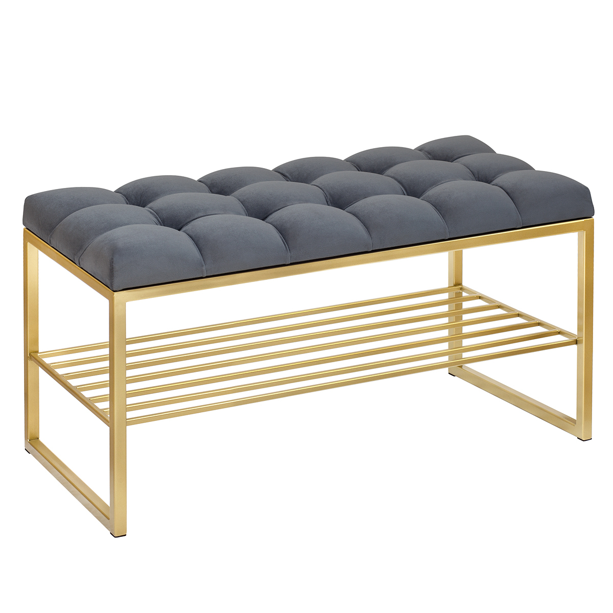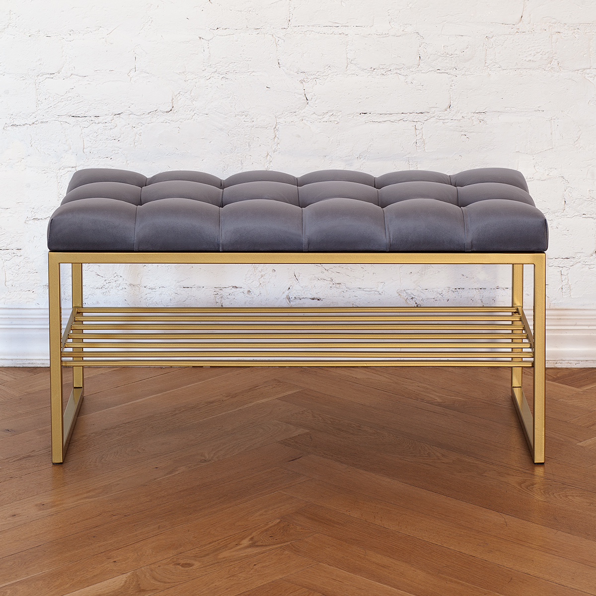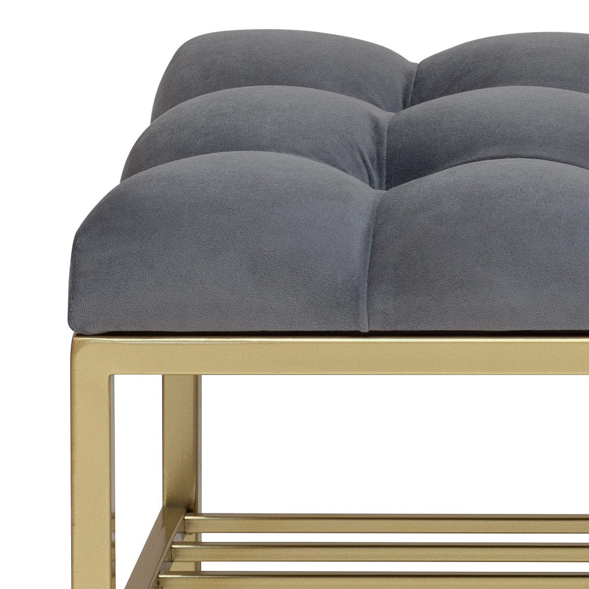 Банкетка RUBY MINI — это стильный и функциональный предмет мебели. У нее золотое основание, мягкое сиденье и удобная полка для обуви.