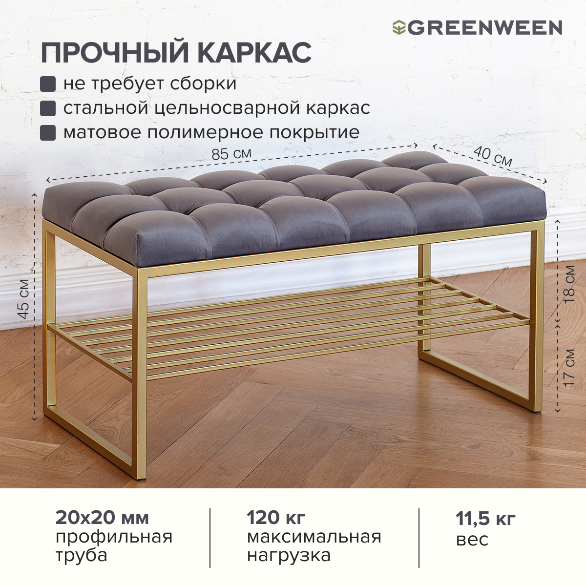 Основание банкетки изготовлено из стали с полимерным покрытием. Собственное производство GreenWeen обеспечивает надежность и эстетику сварных швов металлической мебели.