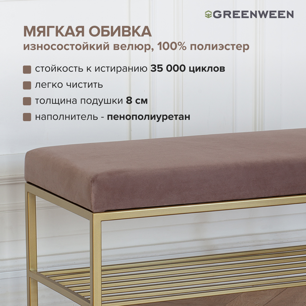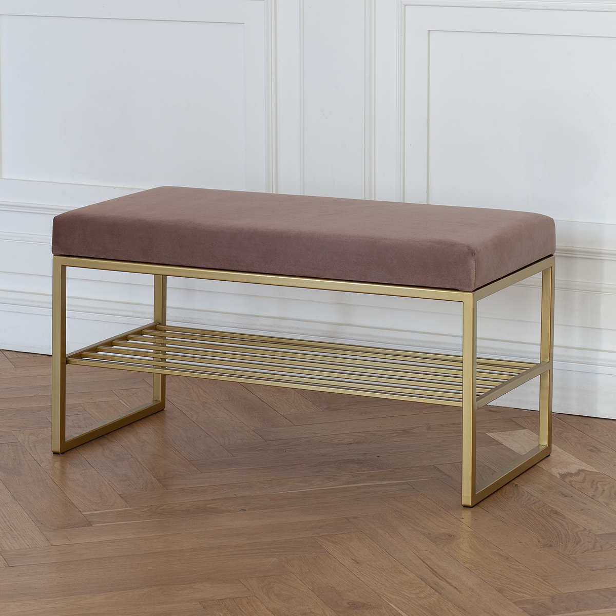 Банкетка RUBY MINI — это стильный и функциональный предмет мебели. У нее золотое основание, мягкое сиденье и удобная полка для обуви.