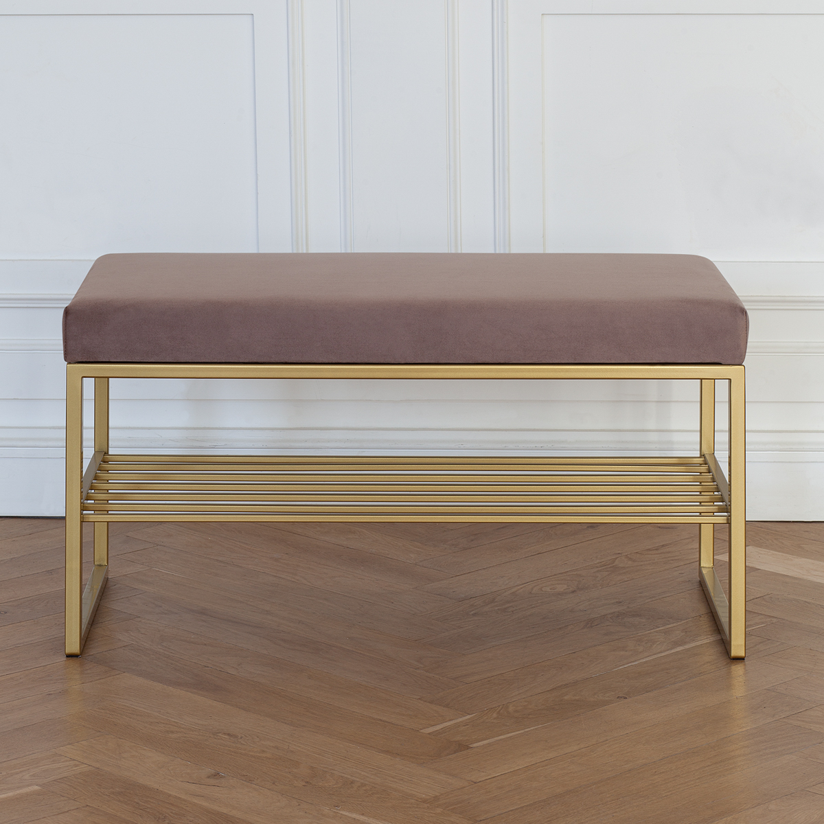 Банкетка RUBY MINI с золотым основанием, полкой для обуви и мягкой велюровой подушкой.
