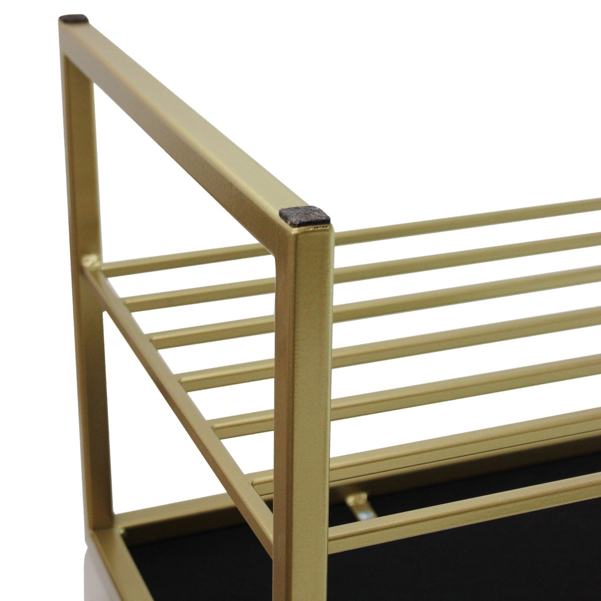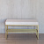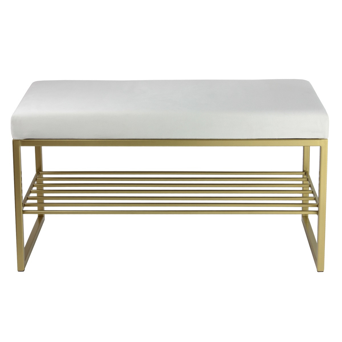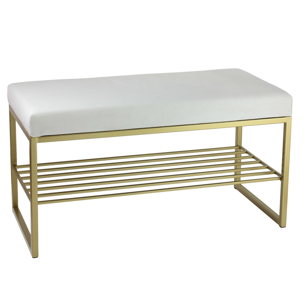 Банкетка RUBY MINI — это стильный и функциональный предмет мебели. У нее золотое основание, мягкое сиденье и удобная полка для обуви.